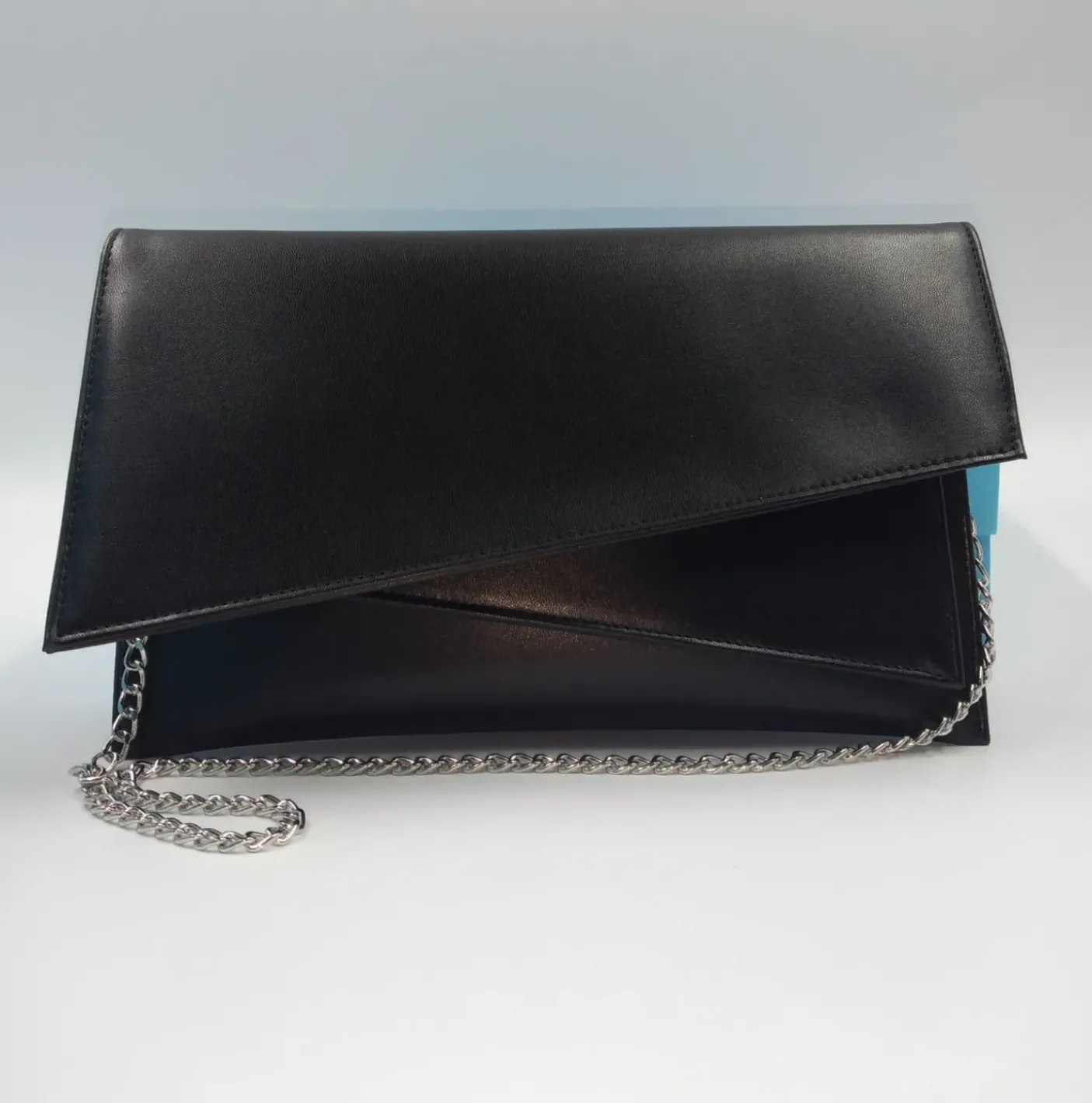Pochette in ecopelle nera, chiusura con patta e bottone clip. Tracolla in catena argento.