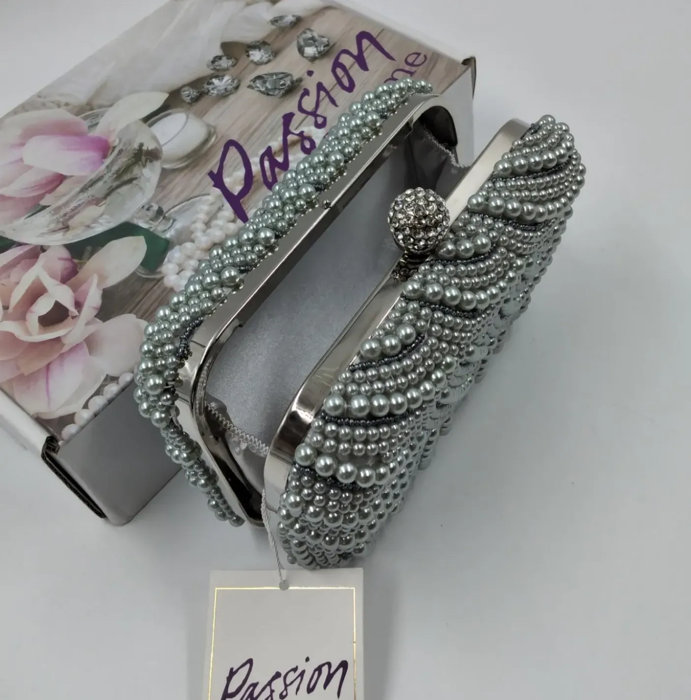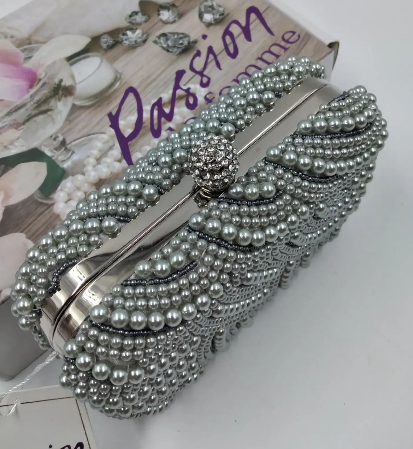 Pochette in base acciaio ricoperta da perle grige. Chiusura con bottone strass. Rivestita internamente in raso.