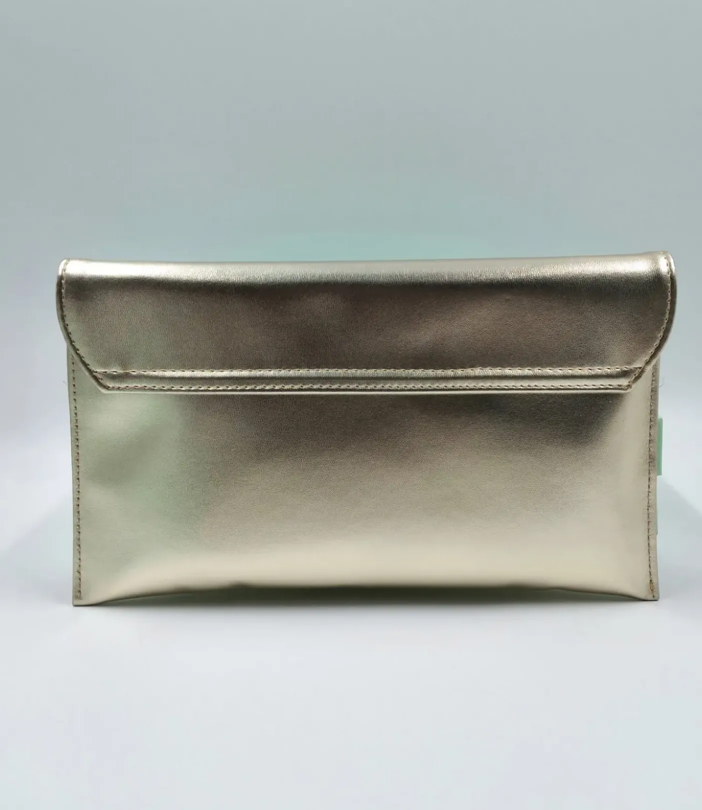 Pochette in ecopelle platino, chiusura con patta e bottone clip. Tracolla in catena oro.