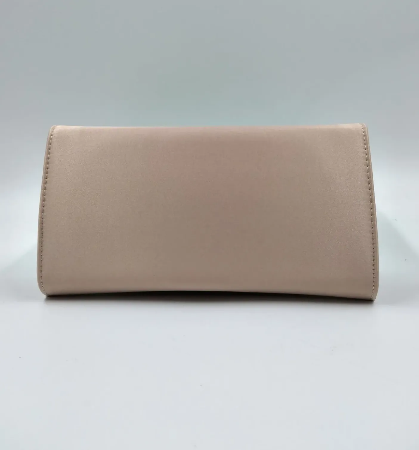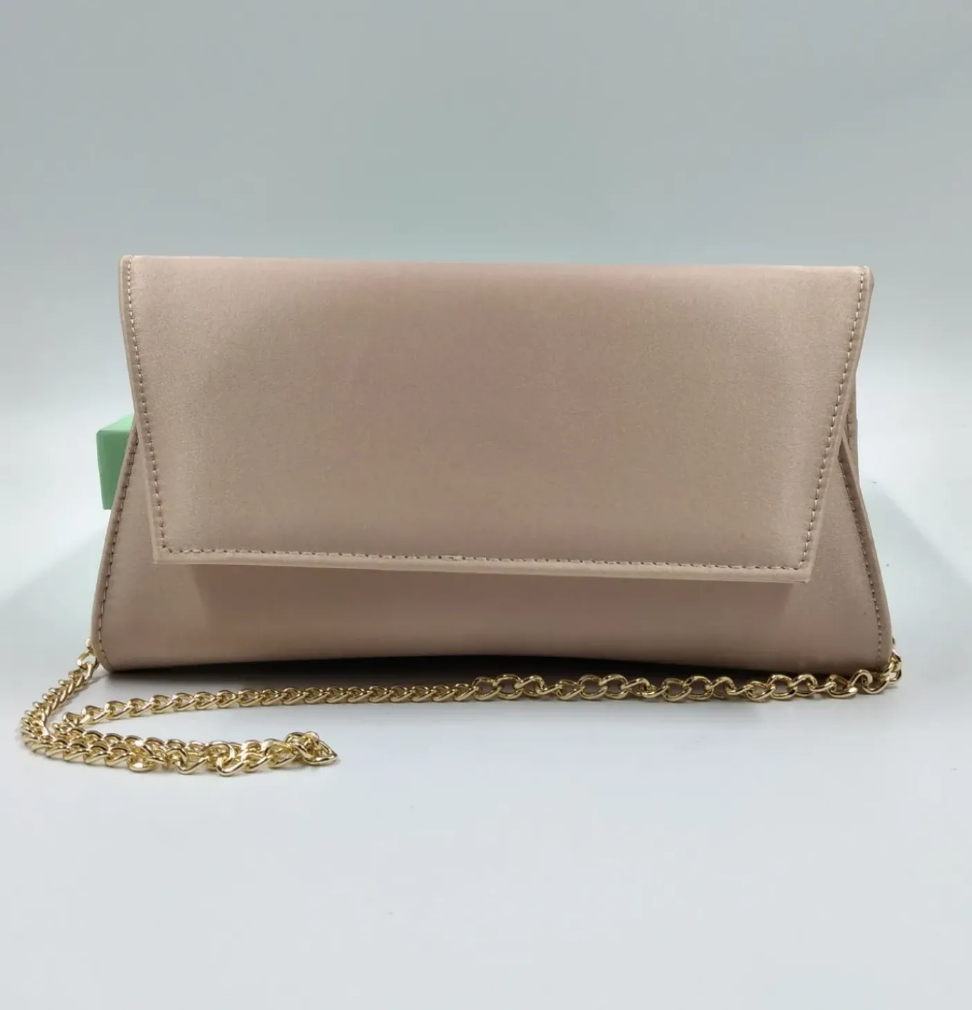 Pochette in pelle rivestita in raso cipria. Chiusura con patta e bottone clip. Tracolla in catena oro.