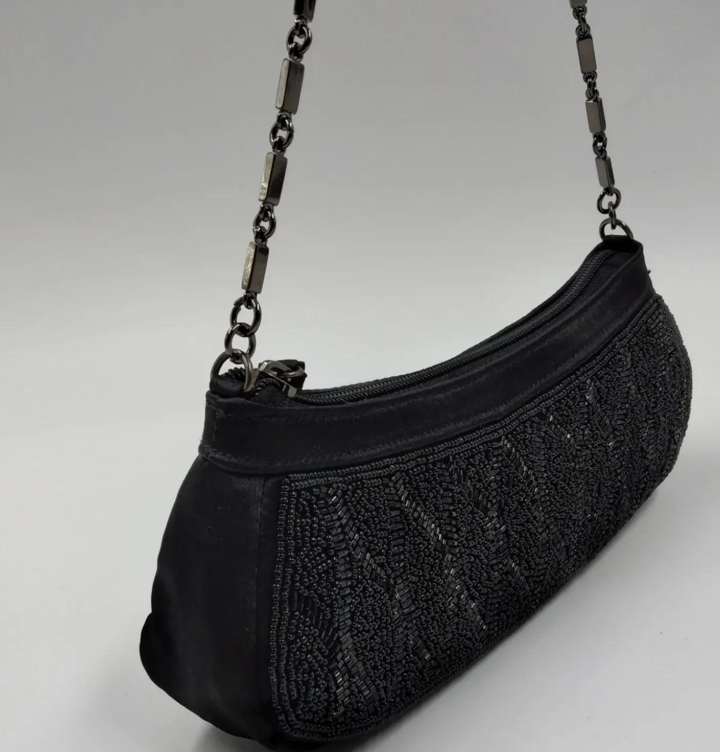 Pochette in raso con decorazione tinta su tinta ricamata con perline nere. Chiusura con zip. Tracolla in metallo decorato. Rivestita internamente in tessuto.