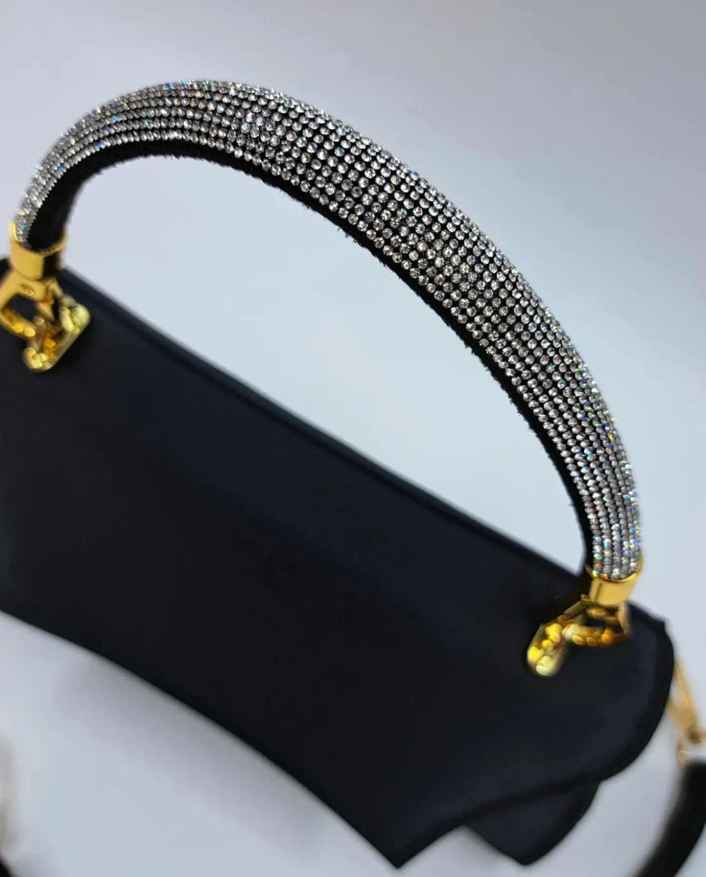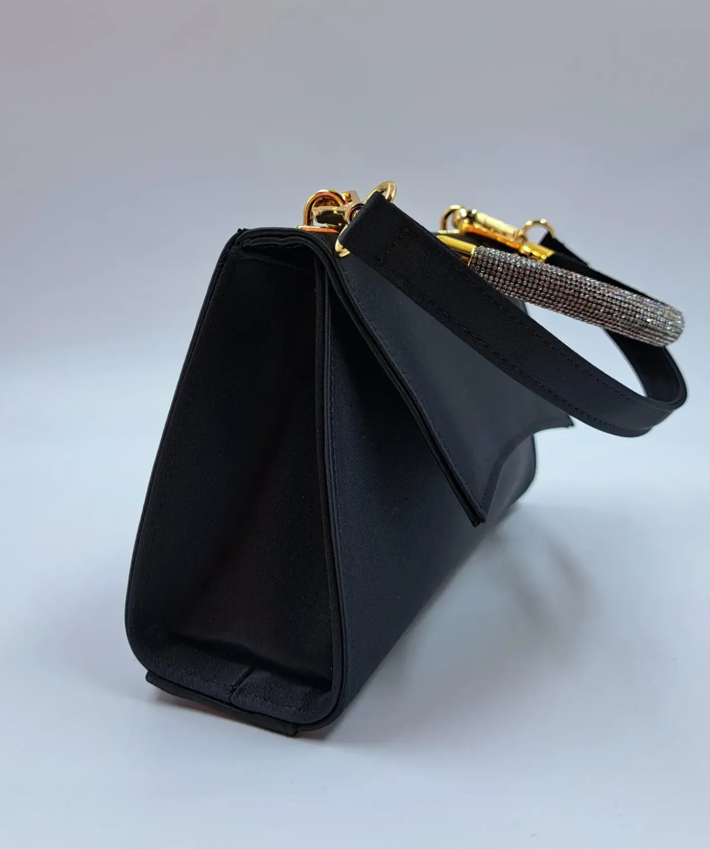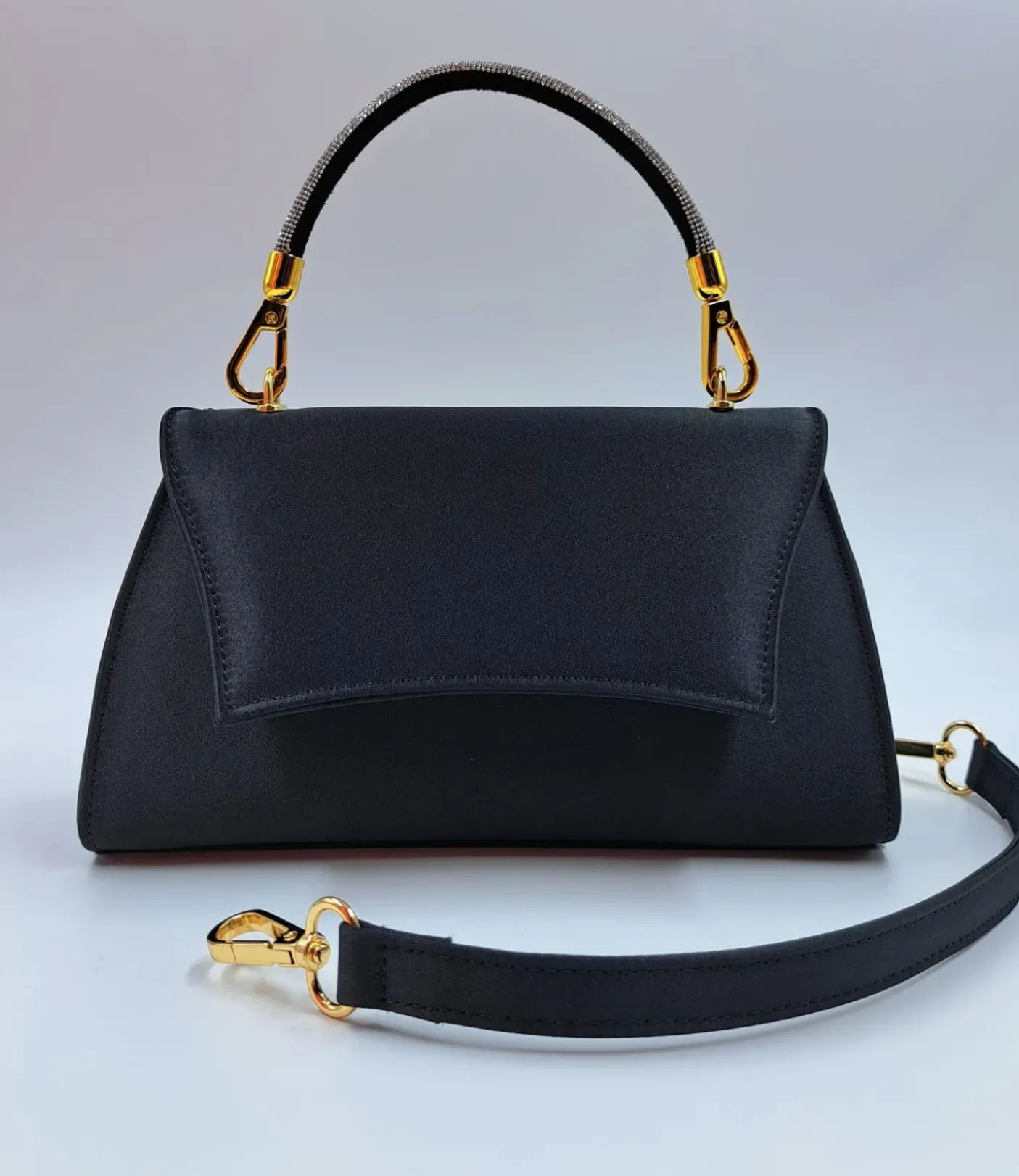 Pochette in raso nero con chiusura a patta con clip. rivestita internamente in tessuto. Dettagli in metallo gold. Doppio manico in strass e tessuto nero removibili.