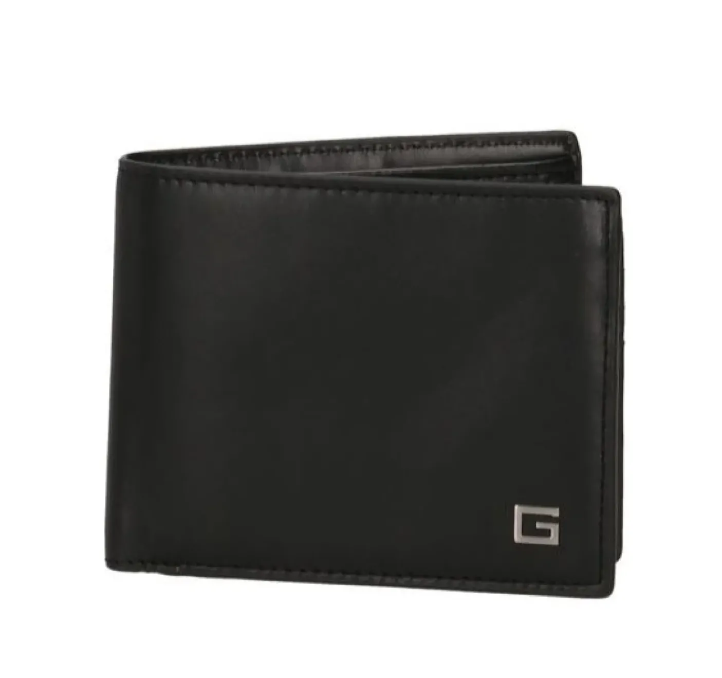 Portafoglio in vera pelle con porta carte e porta monete con clip. Logo metallico argento.