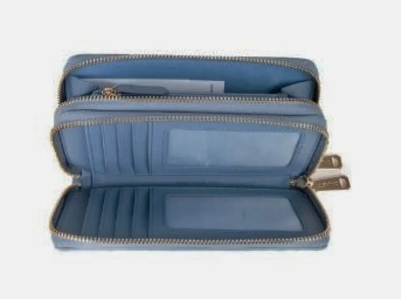Portafoglio ecopelle logo all over. Chiusura doppia cerniera. Multi scomparti porta documenti e carte. Porta spiccioli con zip.