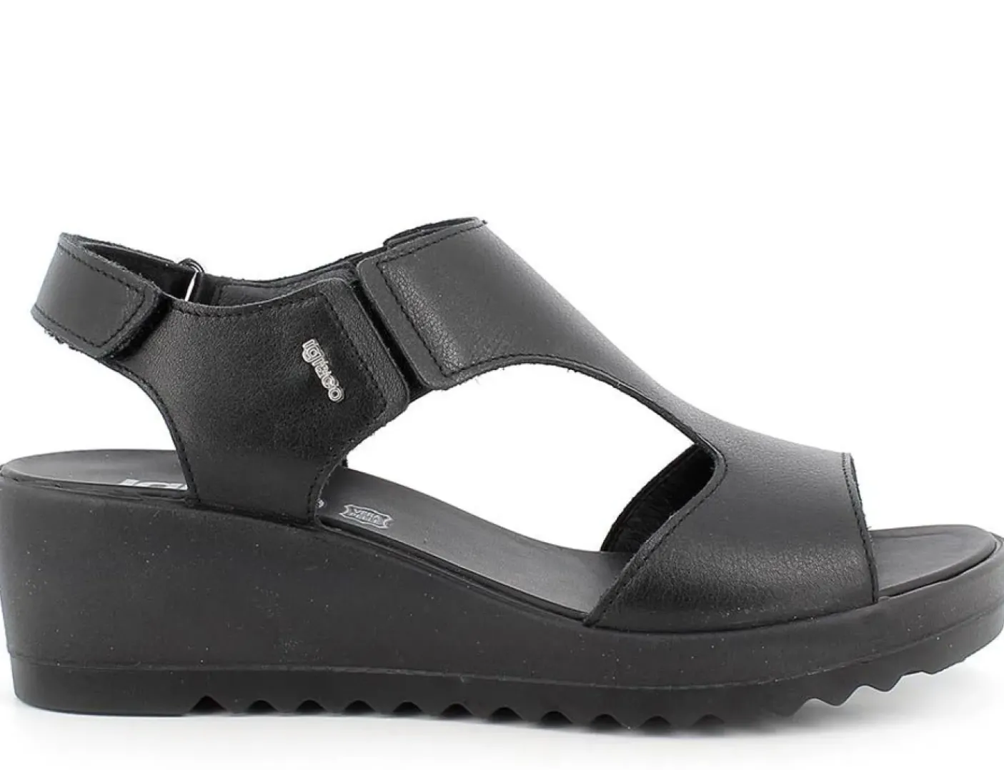 Sandalo in pelle , rivestito internamente in pelle. Con elastici laterali e chiusura con velcro. Fondo gomma. Zeppa 5cm