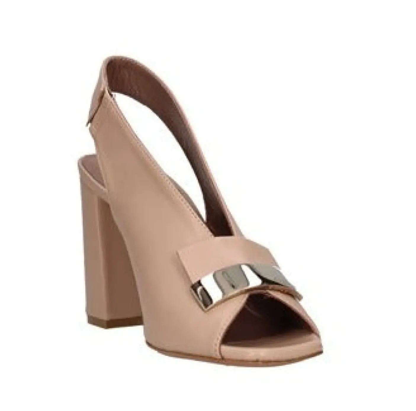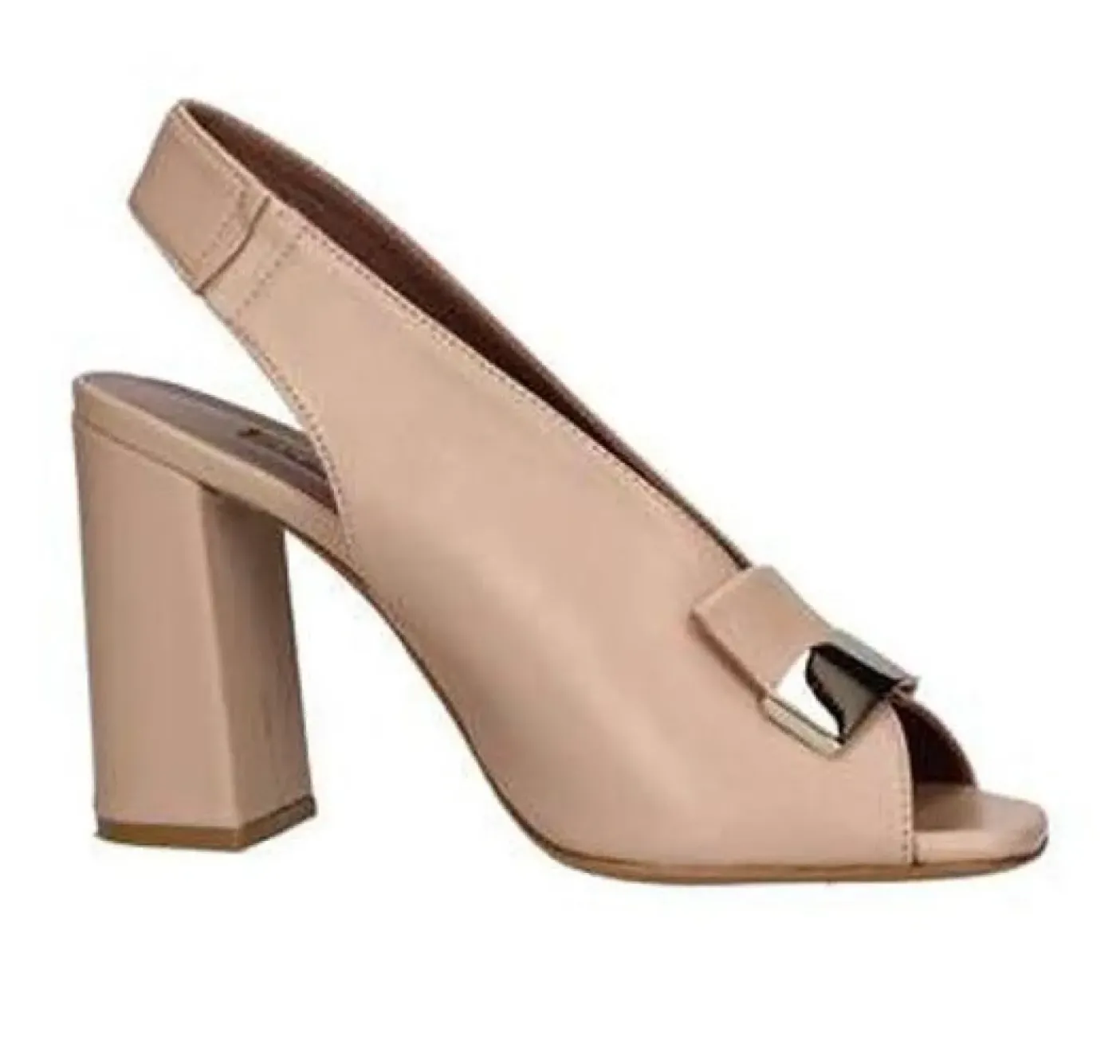 Sandalo in morbida pelle con applicazione color oro in metallo. Rivestito internamente in pelle. Tacco 8cm