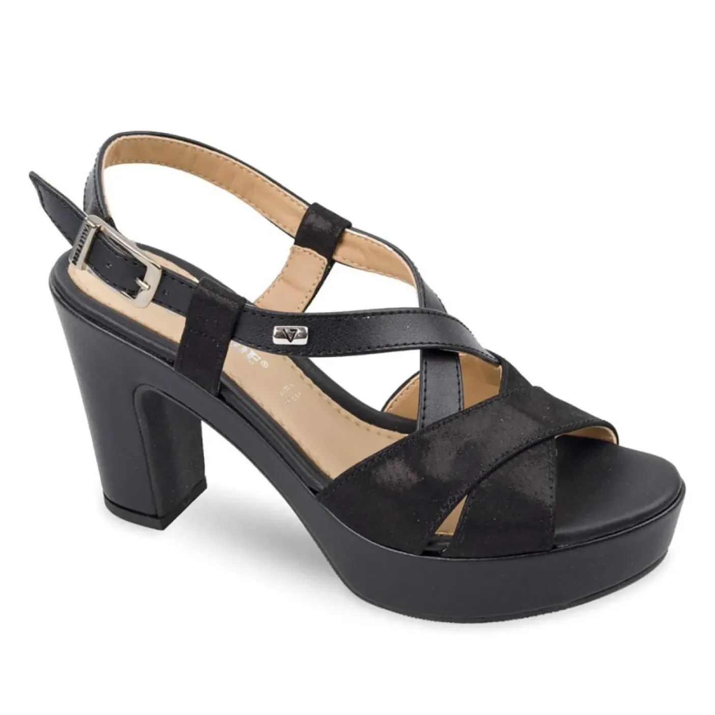 Sandali in ecopelle con fasce incrociate e chiusura con fibbia laterale. Tacco 9cm e plateau 3cm.