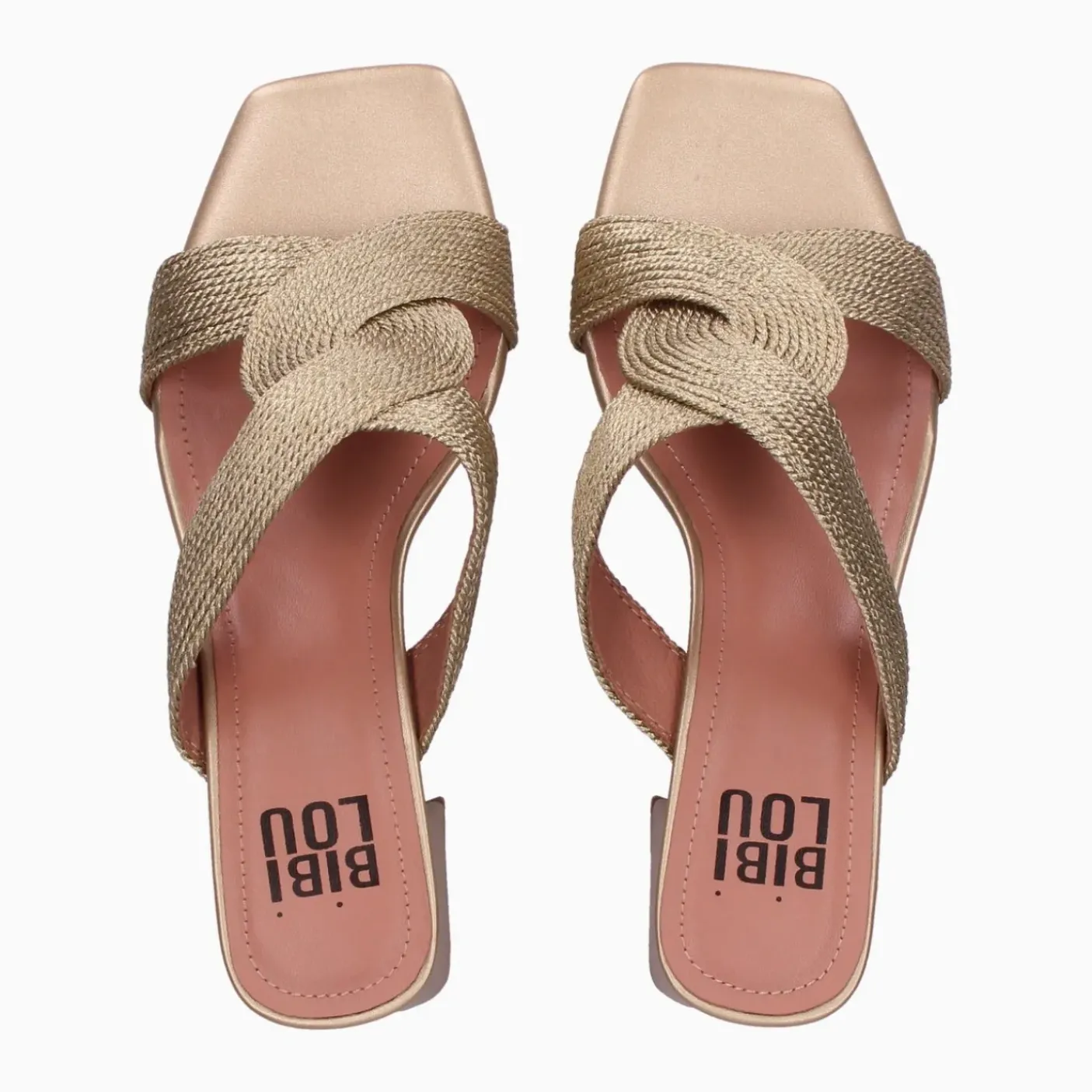 Sandali realizzati in tessuto similcorda ed ecopelle. Rivestito internamente in pelle. Punta squadrata. Fondo in gomma. Tacco 6 cm