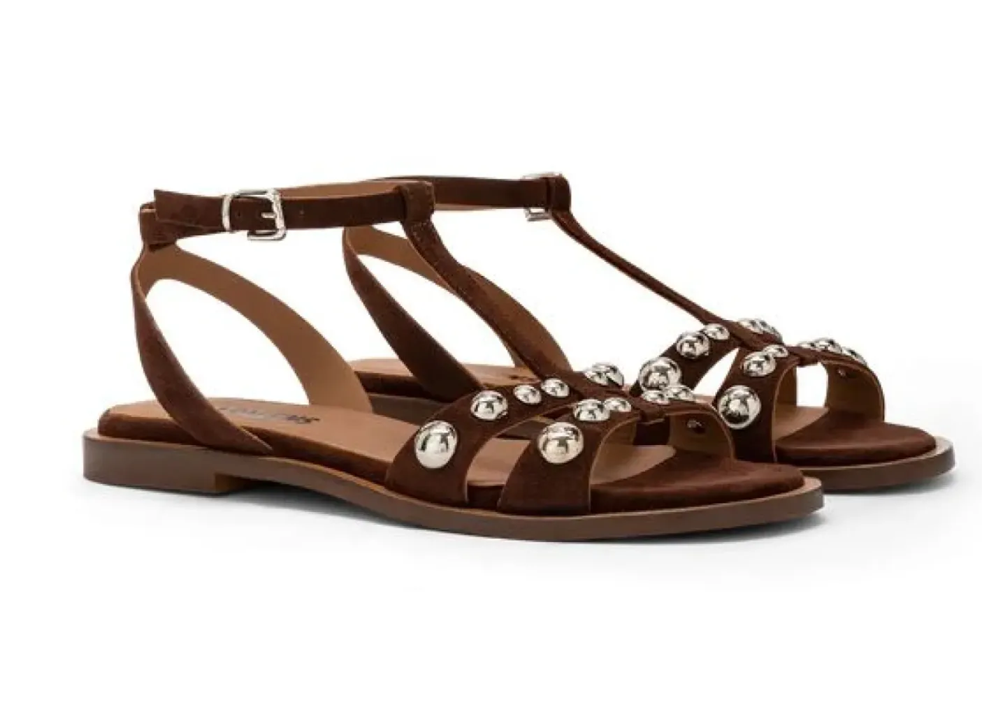 Sandali in pelle con applicazioni sfere metalliche argento. Solette in pelle. Chiusura alla caviglia regolabile. Fondo in gomma 1cm.