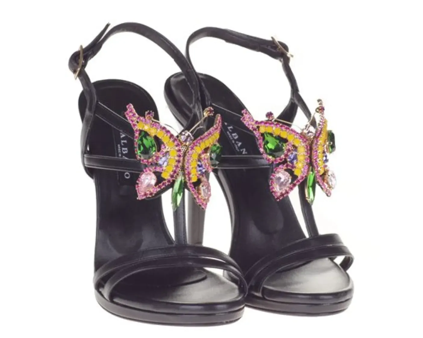 Sandalo in pelle con chiusura con cinturino, applicazione con strass multicolor decorazione farfalla. Un sandalo in vera pelle tutto Made in Italy,