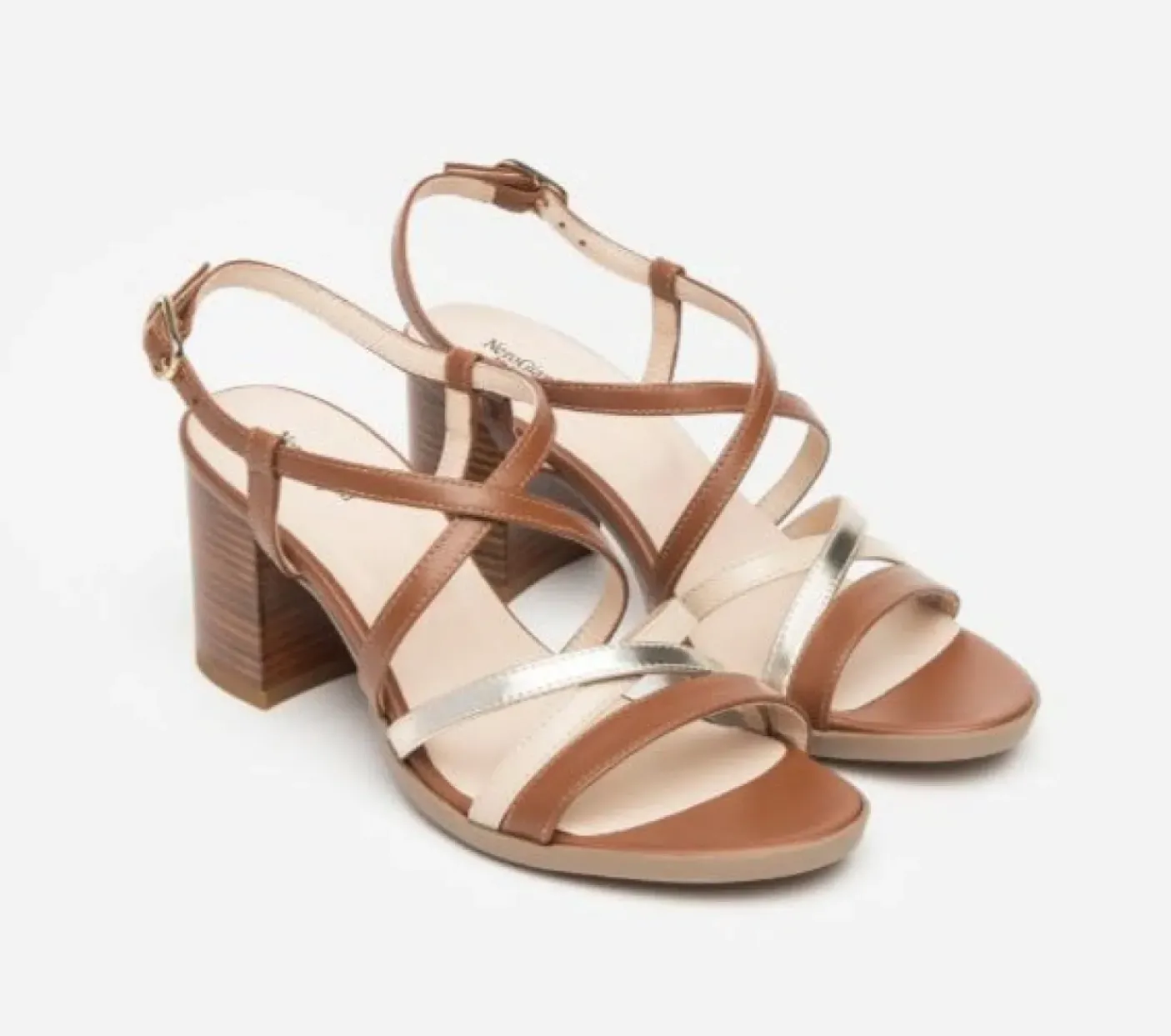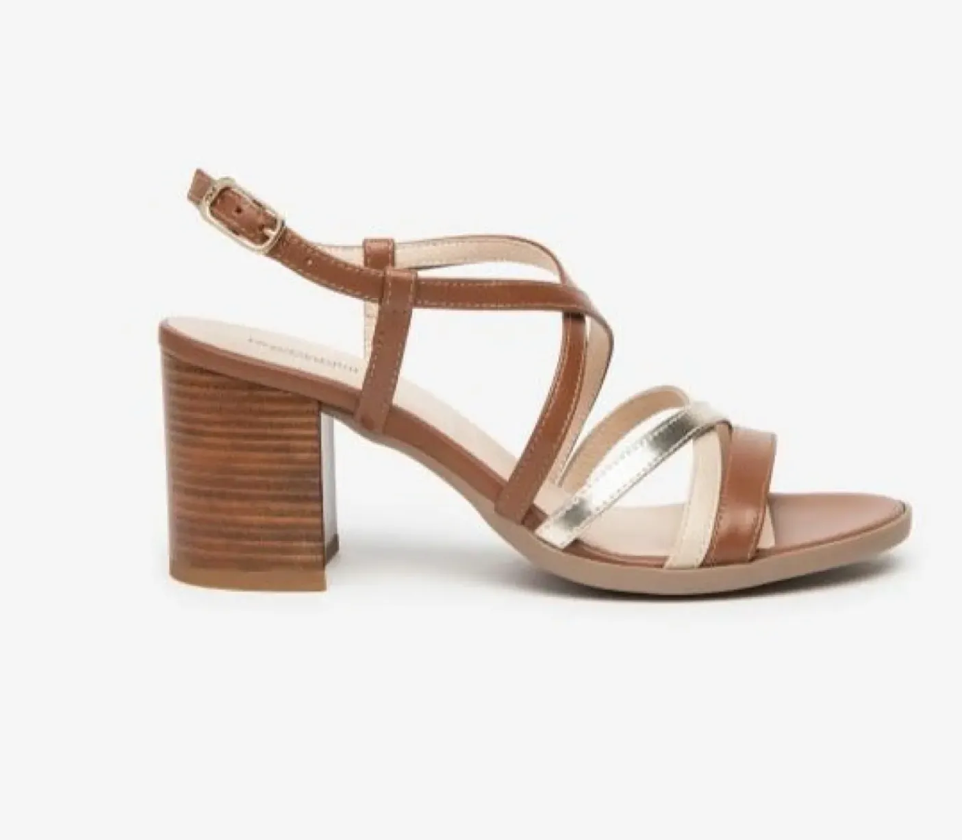 Sandali in pelle con fasce sottili incrociate cognac, oro e lino. Solette in pelle. Chiusura alla caviglia regolabile. Tacco 7cm.