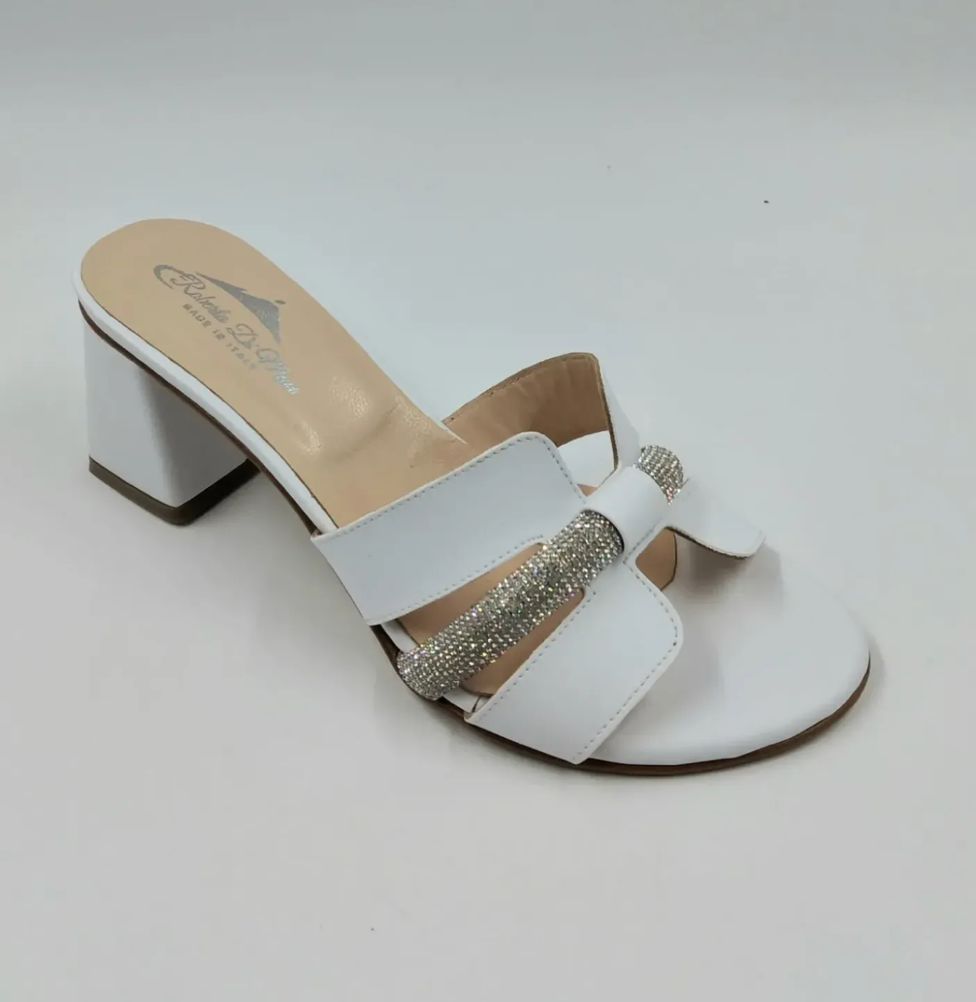 Sandali scalzati bianchi con applicazioni strass. Soletta in pelle. Tacco squadrato 5cm