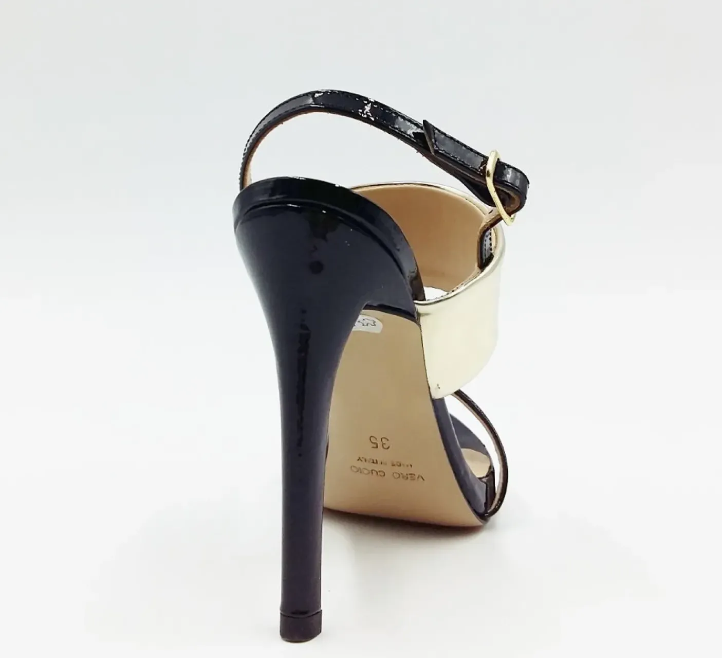Sandalo realizzato in pelle lucida in due colori, fascia oro e cinturino con fibbia. Pelle morbida confortevole Tacco rivestito in pelle lucida 12 cm. Rivestito internamente in pelle. Suola in vero cuoio. Materiali e lavorazione Made in Italy