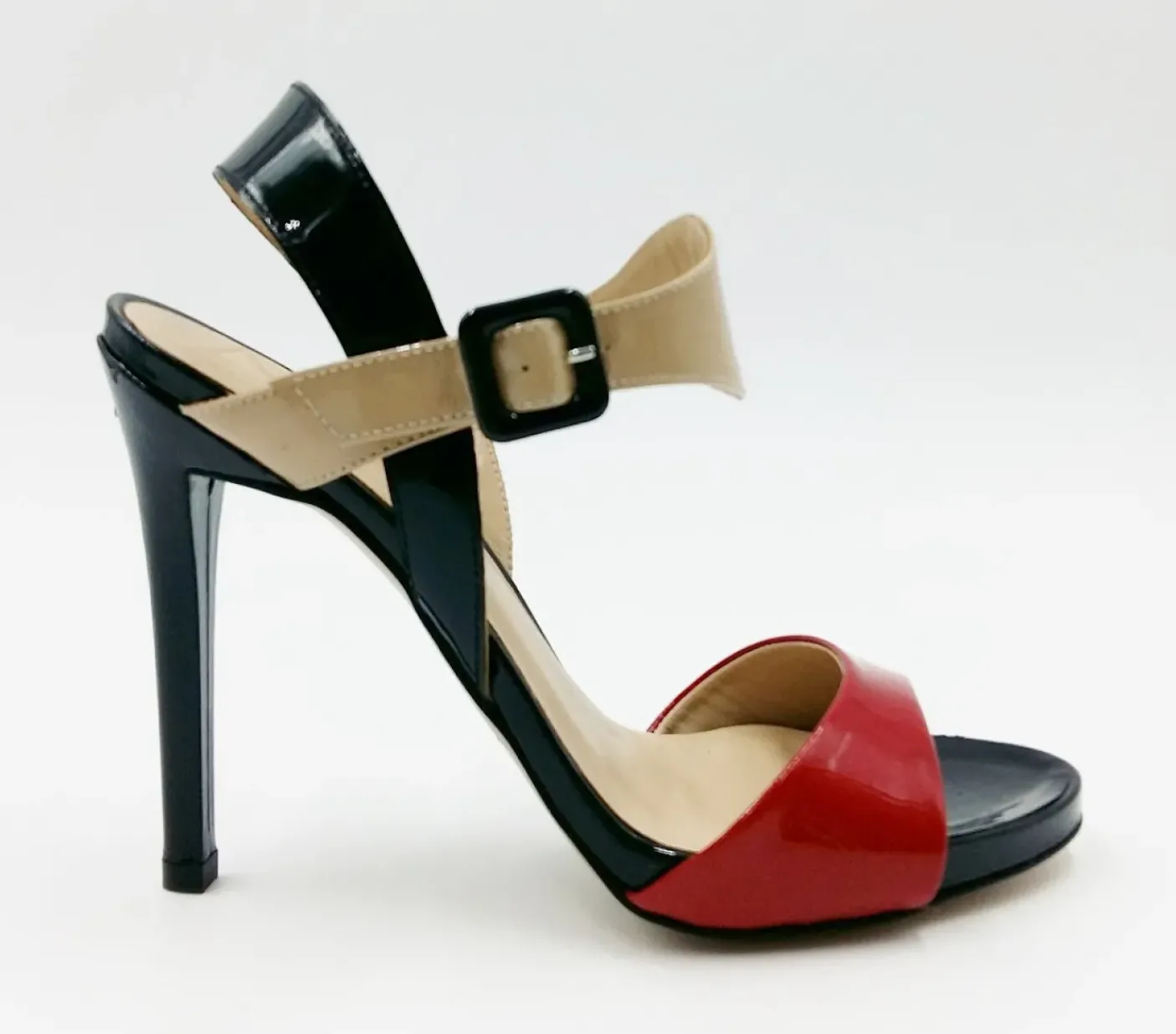 Sandalo realizzato in pelle lucida in due colori. Morbido. Chiusura con cinturino con fibbia. Rivestito internamente in pelle. Suola in vero cuoio.Tacco rivestito in pelle lucida 12 cm.