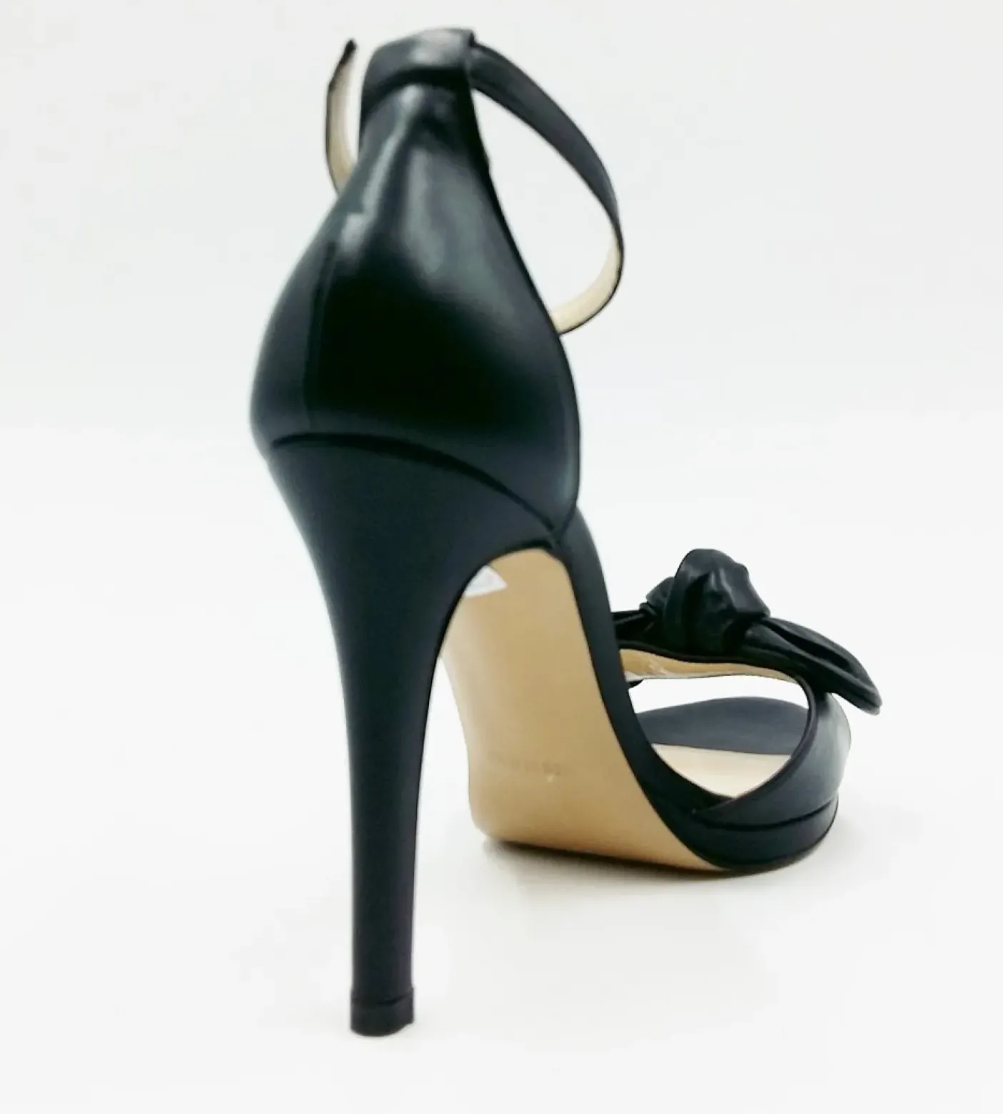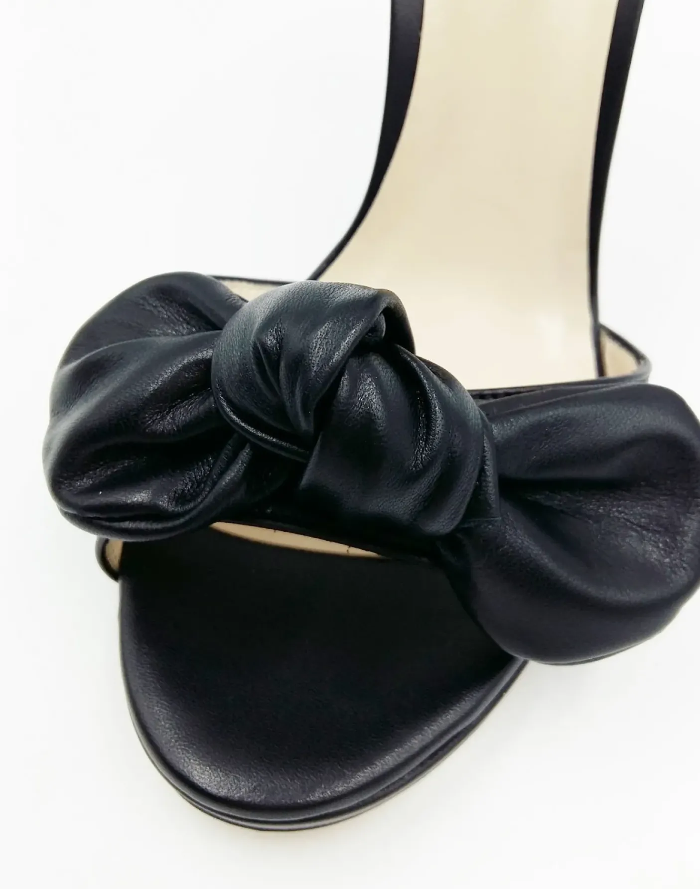 Sandalo in pelle nera morbida, rivestito interamente in pelle. Decorazione con fiocco in pelle. Cinturino con fibbia alla caviglia. Tacco rivestito in pelle 12 cm. Fondo in vero cuoio.