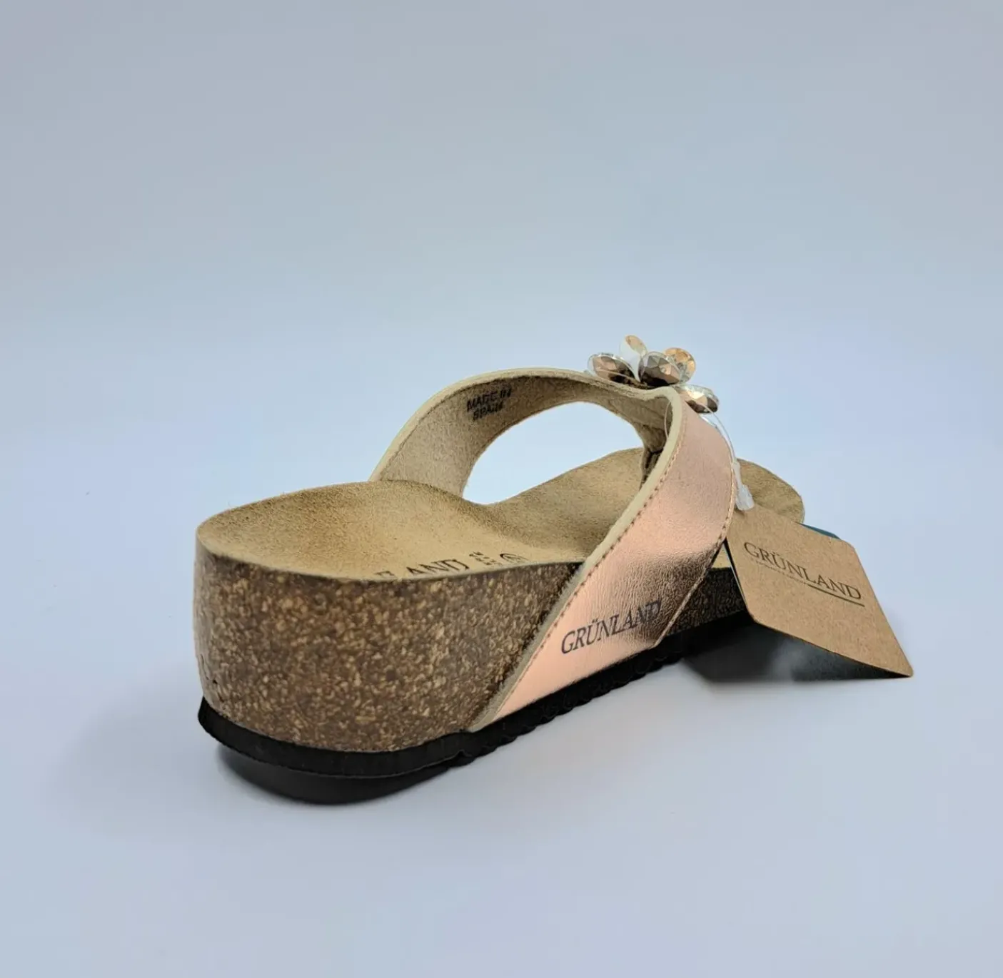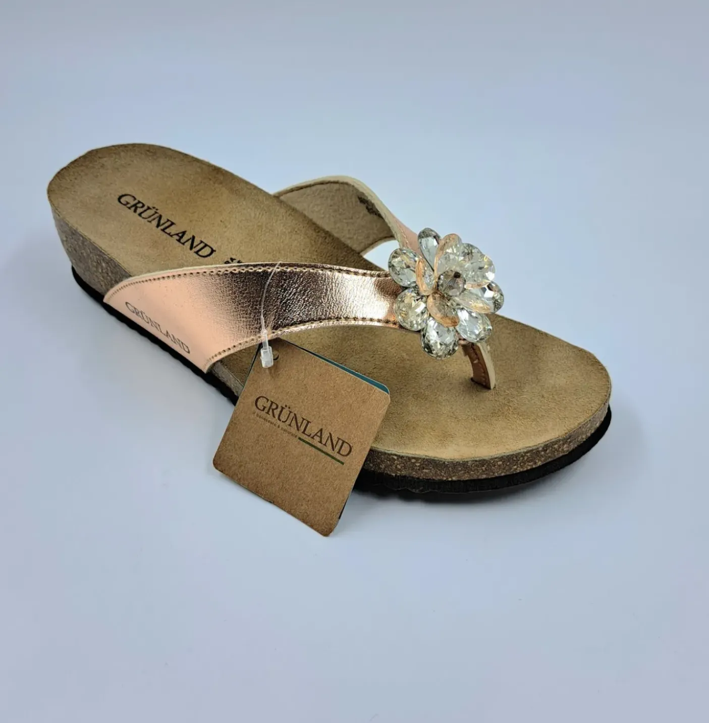 Sandalo infradito con plantare in mescola di lattice e sughero naturale. Materiale ecopelle impreziosito con pietre bianche fiore. Suola anatomica antisdrucciolo in microporosa. Altamente ammortizzante, leggera e flessibile 4 cm.