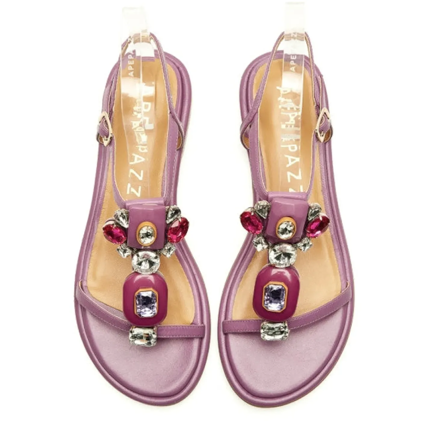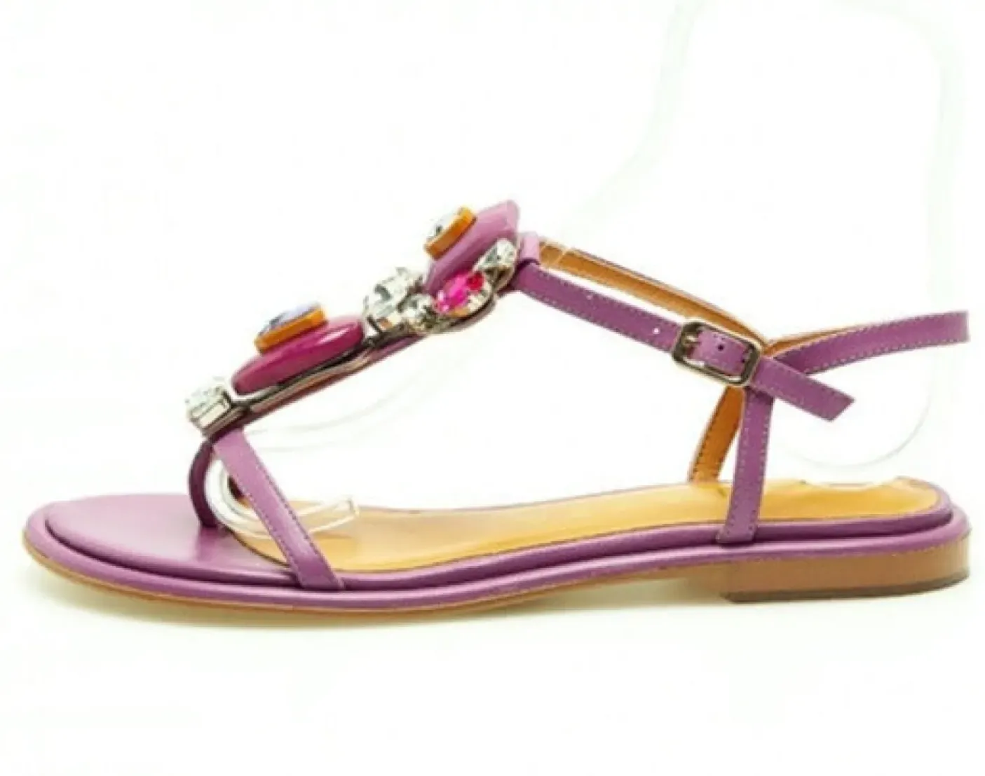 Sandali in pelle infradito con applicazioni pietre lilla e strass bianchi e lilla. Fondo in pelle. Chiusura regolabile.
