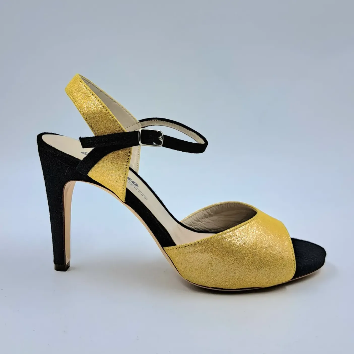 Sandali in tessuto lux, rivestito in vera pelle. Soletta in pelle. Chiusura regolabile in pelle lucida.Tacco 10cm