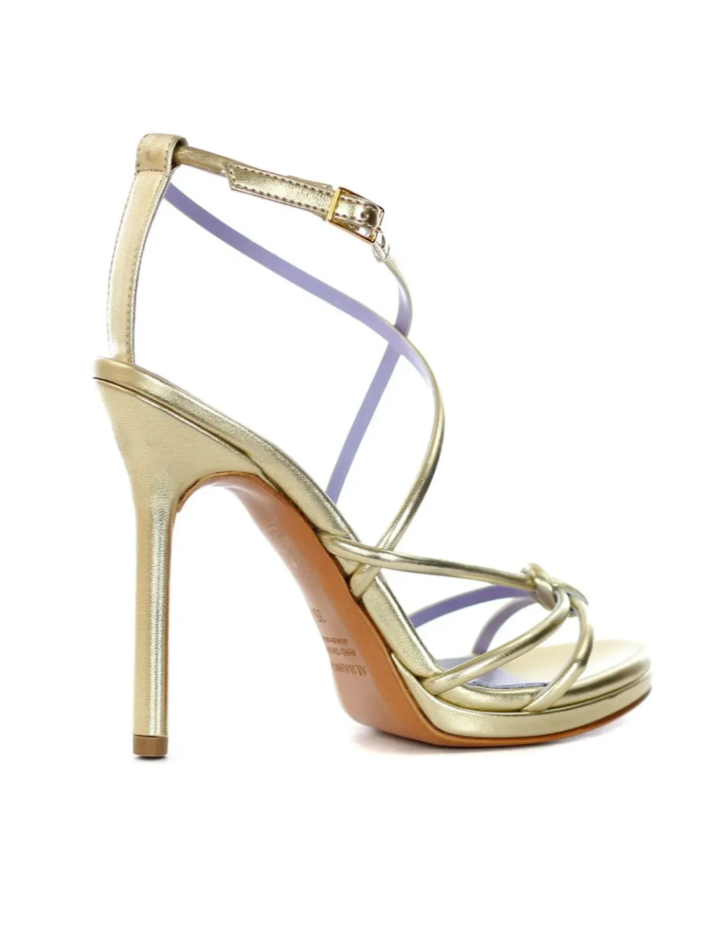 Sandali con lacci intrecci. Rivestito internamente in pelle. Chiusura laterale regolabile. Fortino posteriore sottile. Soletta in pelle. Tacco 11cm. Suola in cuoio.