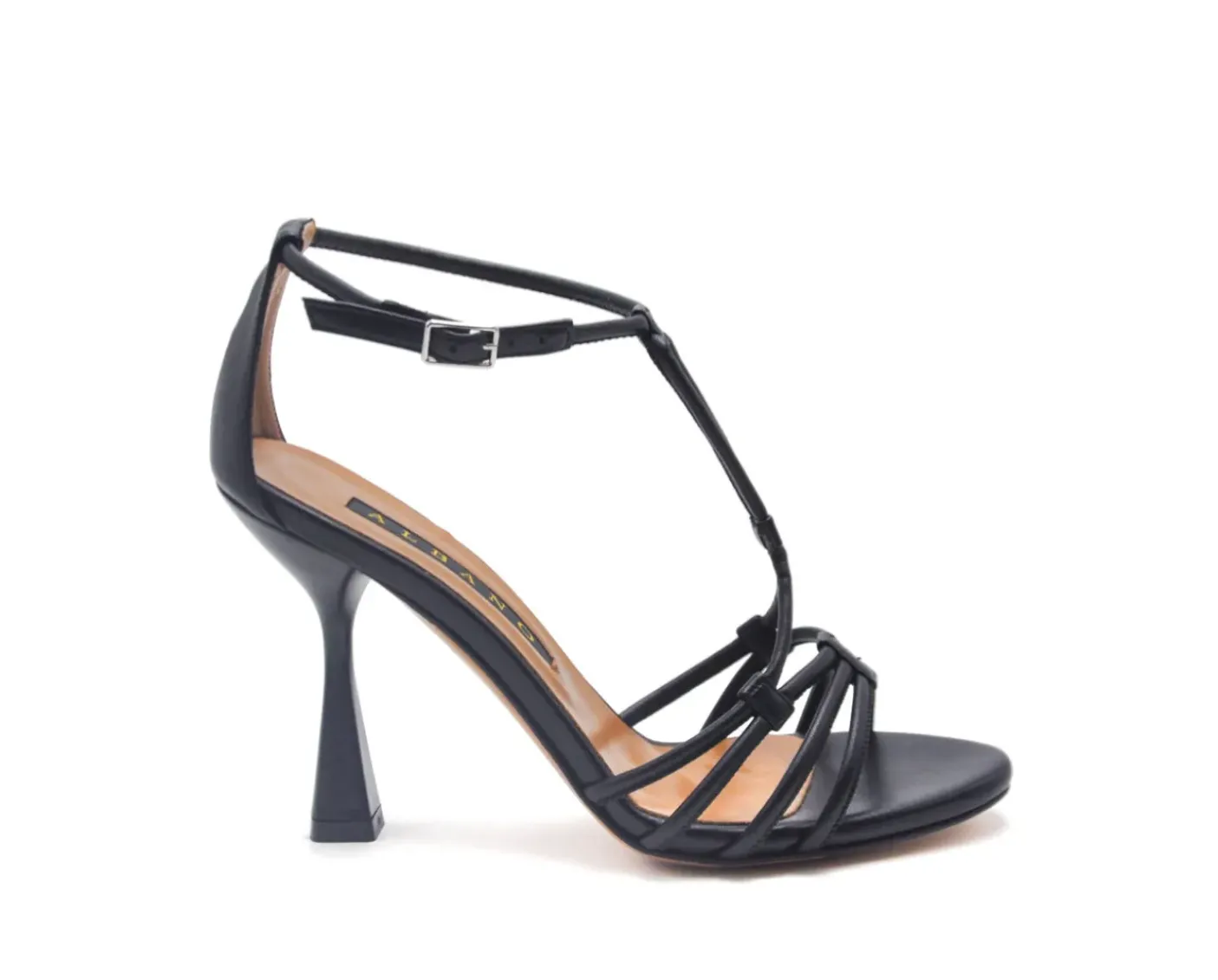 Sandalo in microfibra nero, con cinturino alla caviglia. Rivestito in pelle. Suola in cuoio.
