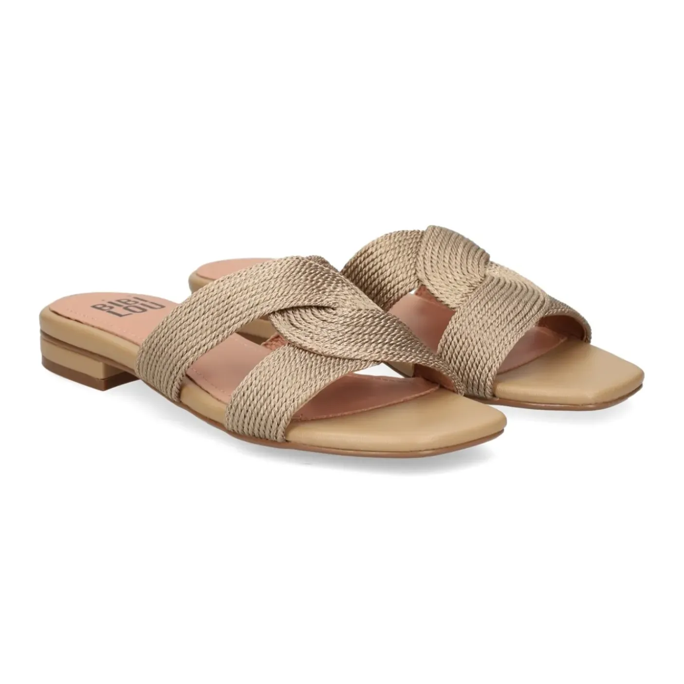 Sandali realizzati in tessuto similcorda ed ecopelle. Rivestito internamente in pelle. Punta squadrata. Fondo in gomma. Tacco 1,5 cm