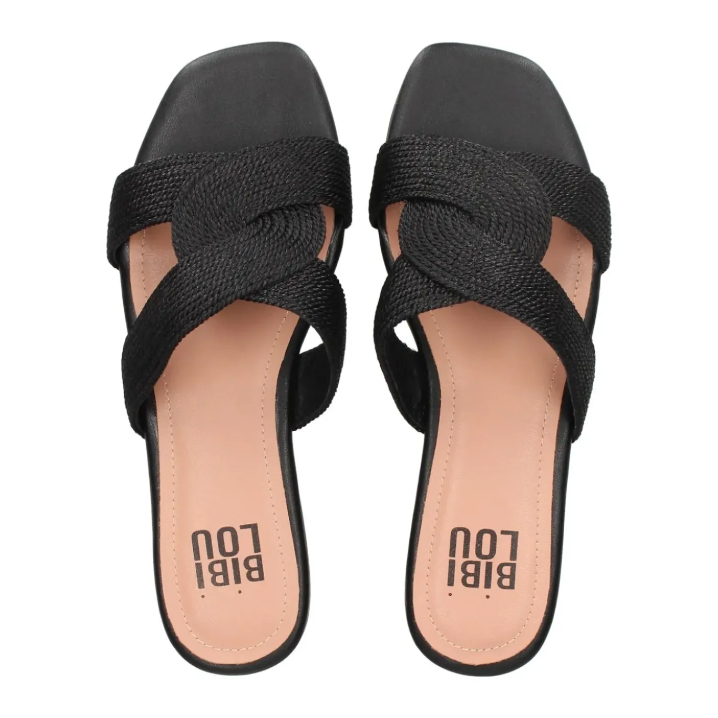 Sandali realizzati in tessuto similcorda ed ecopelle. Rivestito internamente in pelle. Punta squadrata. Fondo in gomma. Tacco 1,5 cm