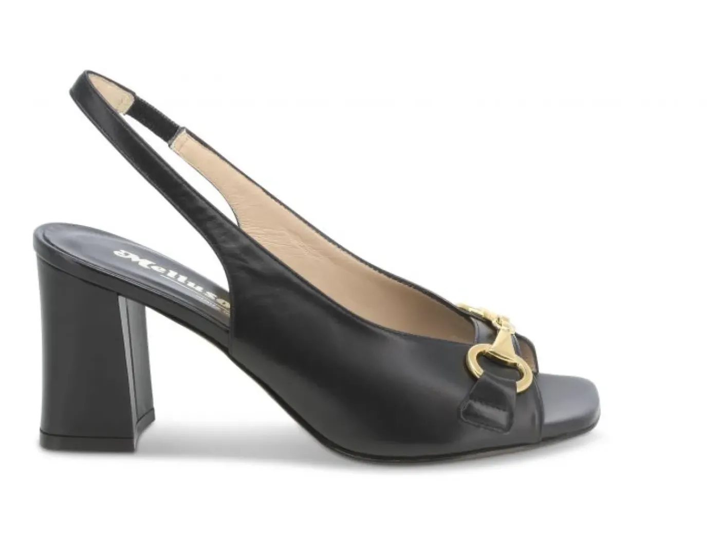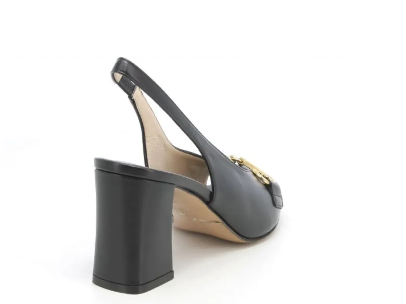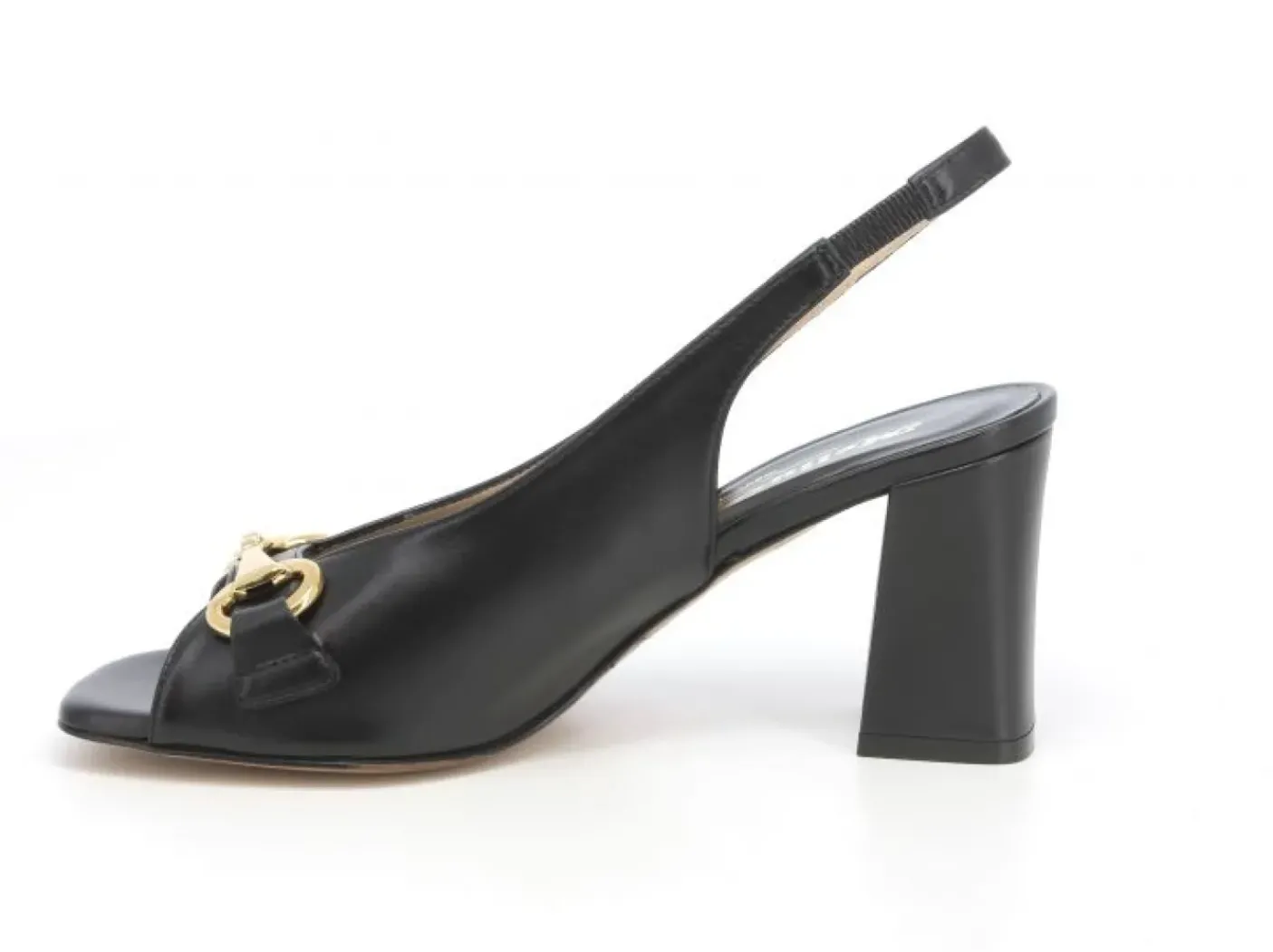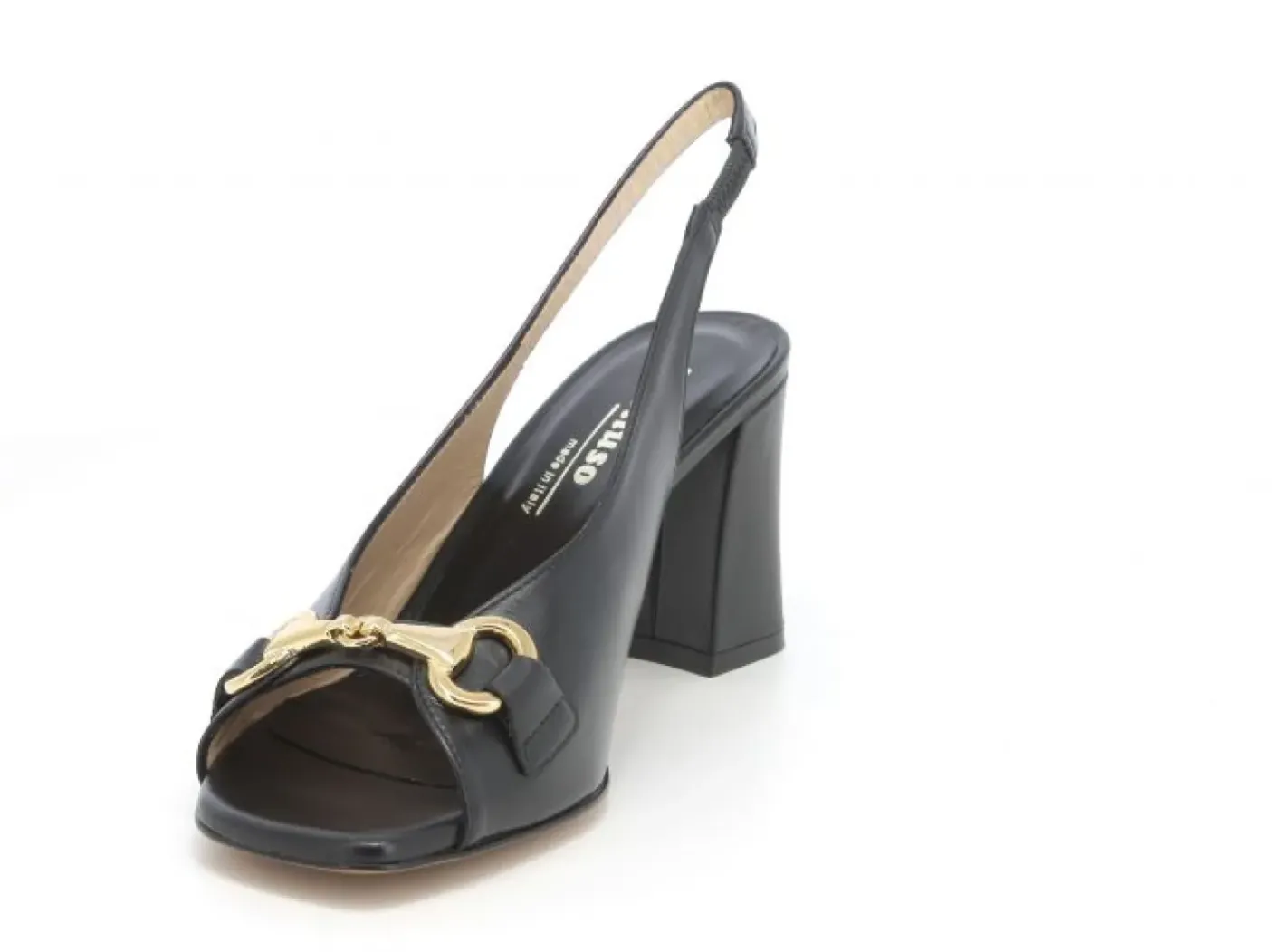Sandali in vera pelle nera, rivestito internamente in pelle. Fibbia metallica oro sul davanti. Elastico laterale. Tacco 7cm