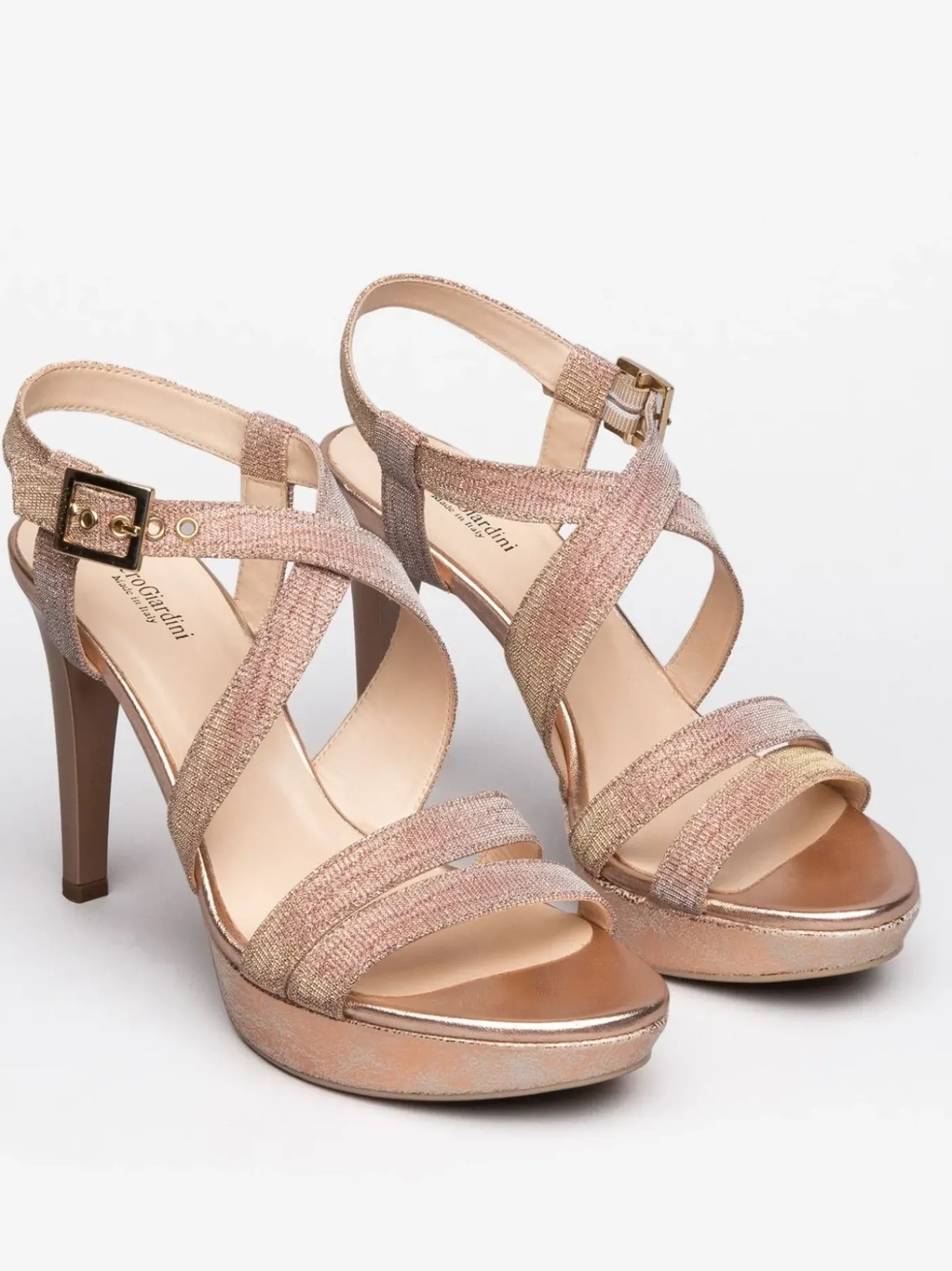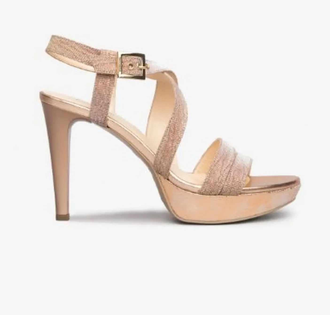Sandali in tessuto lux rivestito internamente in pelle. Soletta in pelle. Doppia fascia sul piede. Chiusura con fibbia regolabile. Fondo gomma. Tacco 10cm