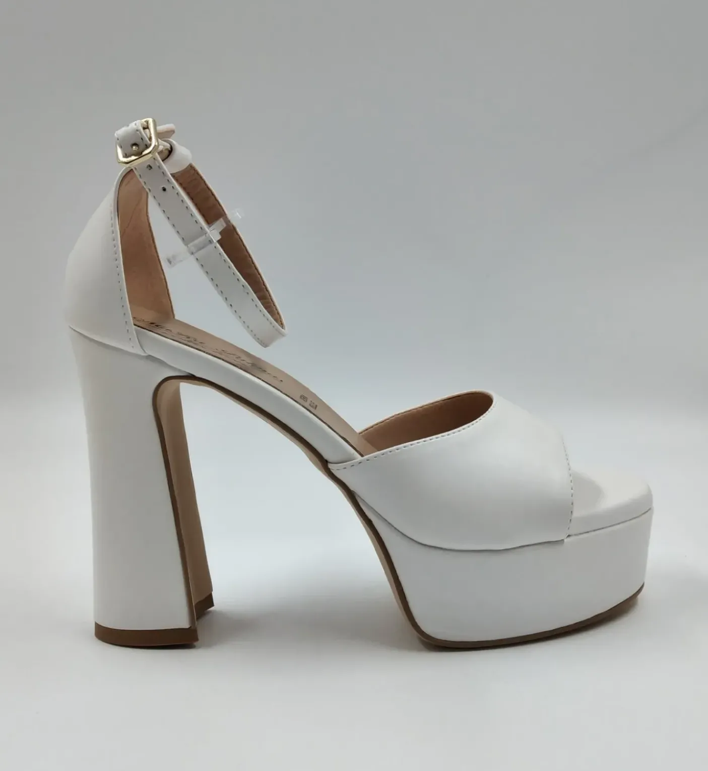Sandali in ecopelle con fascia. Soletta in pelle. Chiusura regolabile alla caviglia. Tacco 12cm platform 3.5cm