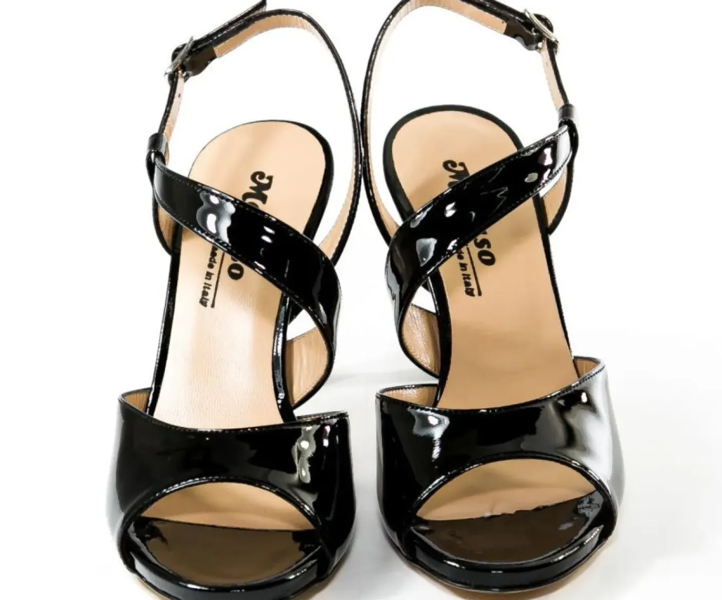 Sandali in pelle lucida, rivestiti internamente di pelle. Chiusura con fibbia laterale. Tacco 9cm