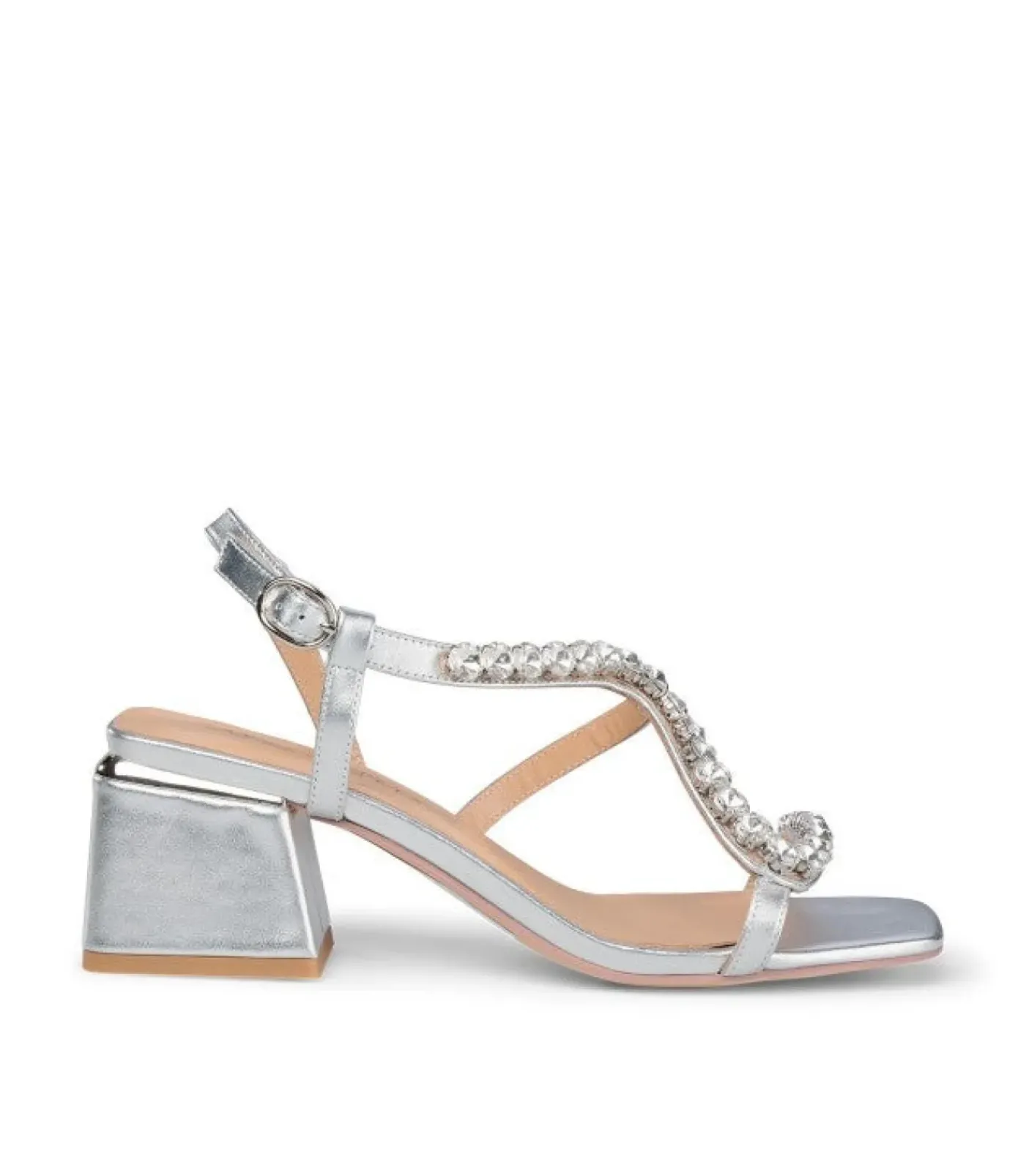 Sandalo con dettaglio strass silver. Chiusura con fibbia regolabile. Soletta imbottita. Altezza tacco 6 cm.