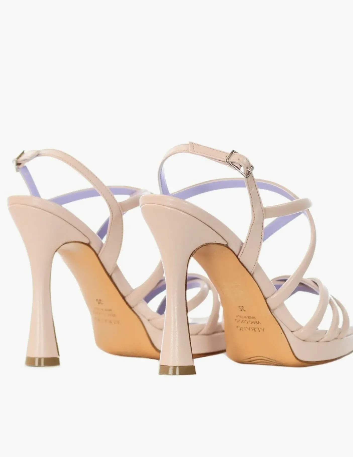 Sandali in pelle con fasce incrociate, chiusura con cinturino regolabile. Rivestito internamente in pelle. Soletta in pelle. Fondo cuoio, tacco 11cm plateau 1cm.