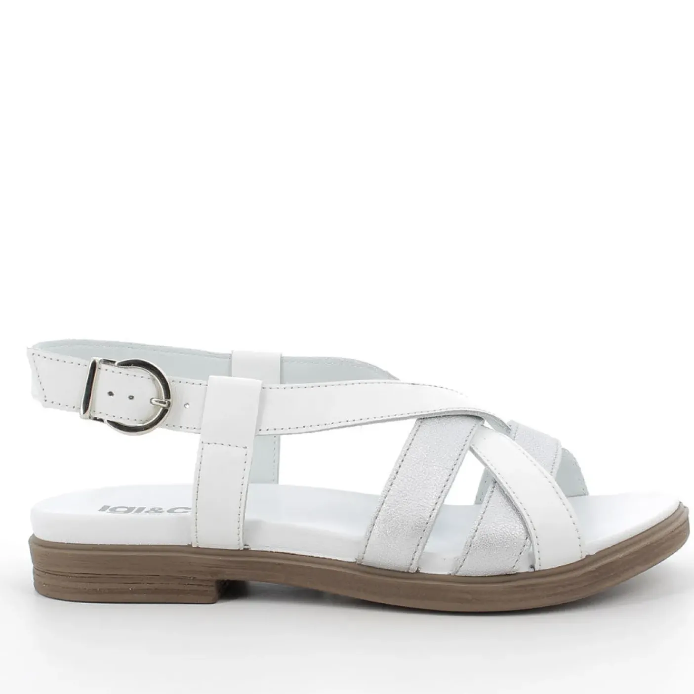 Sandali n pelle bianca e argento. Chiusura con fibbia regolabile. Sottopiede anatomico.