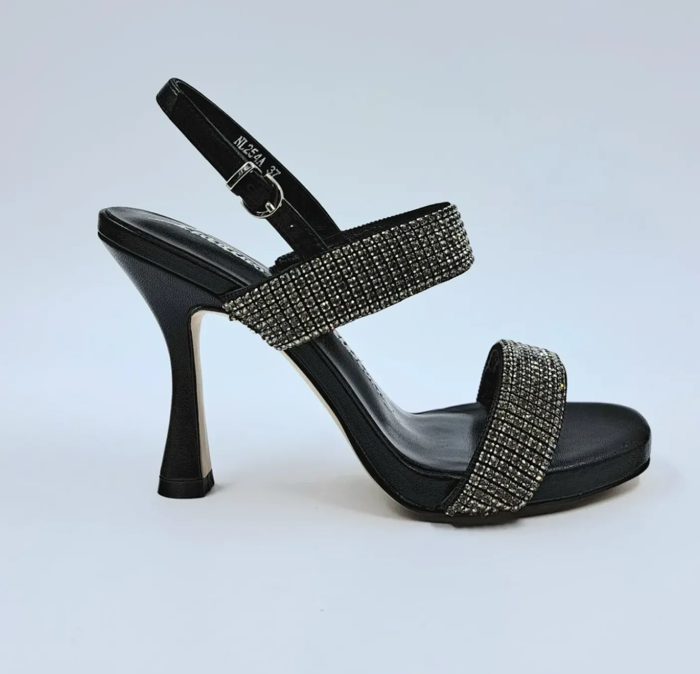 Sandali in vera pelle con fasce multi strass argento. Chiusura con fibbia regolabile. Soletta in pelle. Tacco 10cm