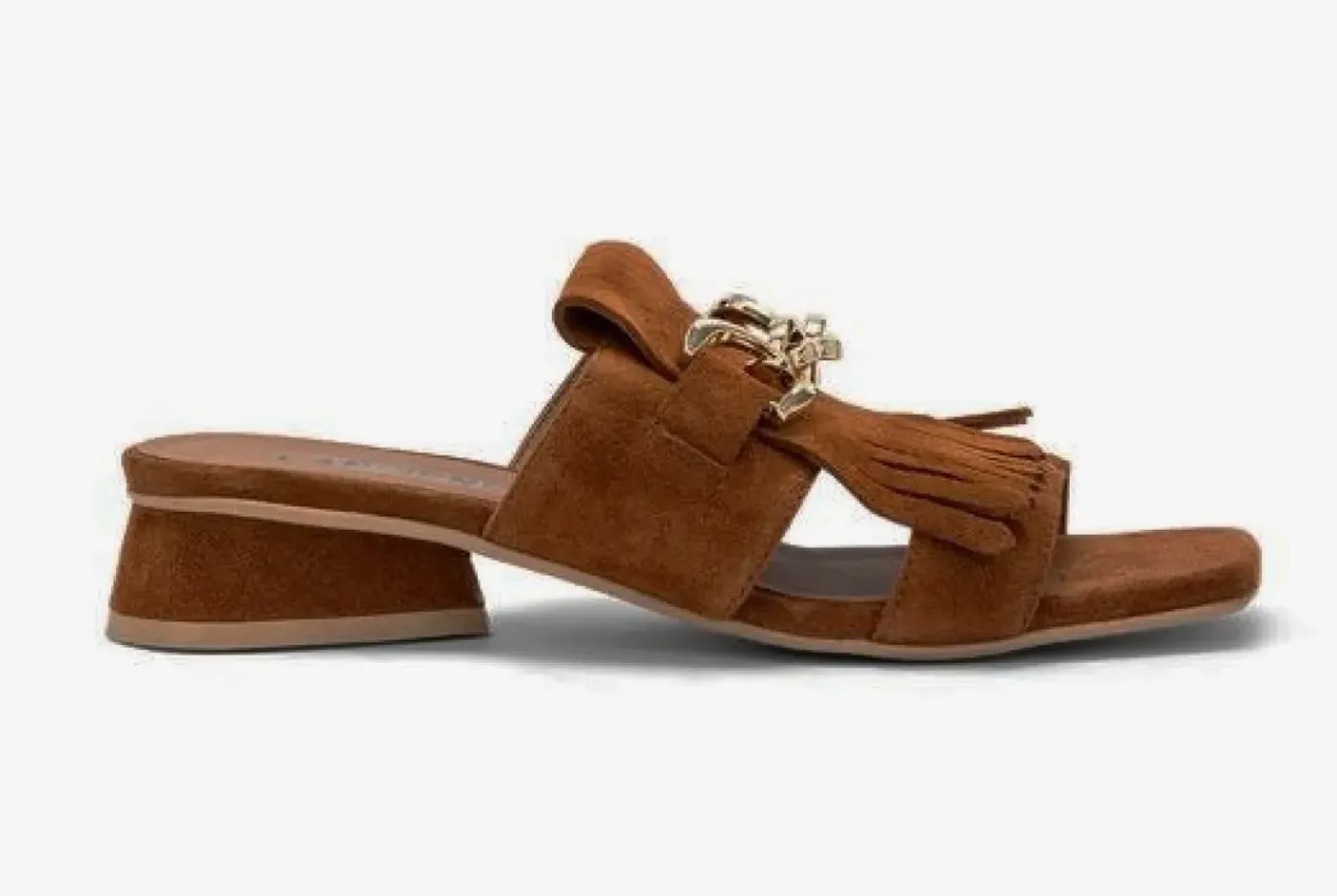 Sandali in vero camoscio morbido, soletta in vera pelle. Decorazione frange in pelle e catena metallica oro. Tacco 2cm
