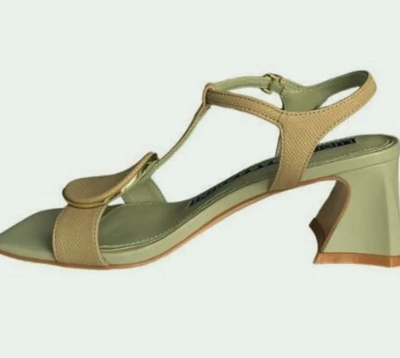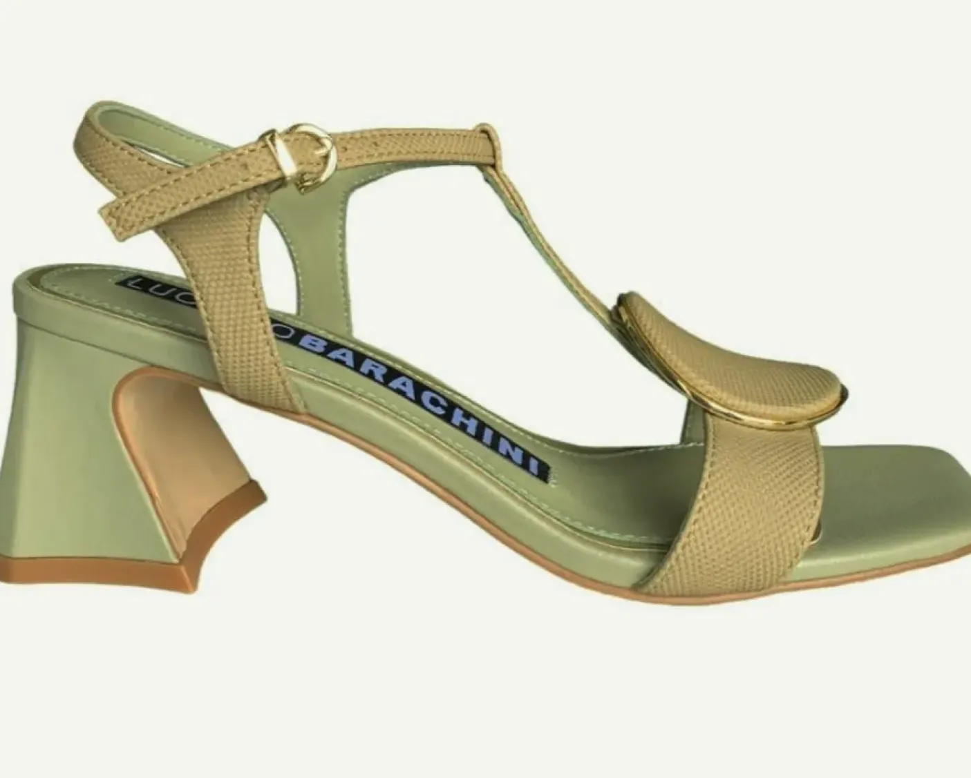 Sandali in vera pelle morbida con soletta in pelle. Chiusura alla caviglia regolabile. Tacco squadrato 7cm. Applicazione metallo e pelle ovale.