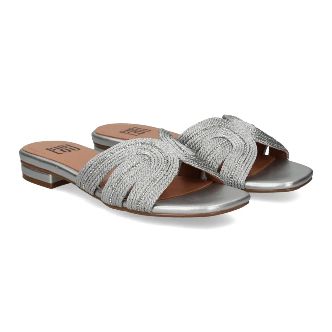 Sandali in materiale sintetico effetto intrecciato con micro strass. Rivestito internamente in pelle. Punta squadrata. Tacco piatto 1,5 cm