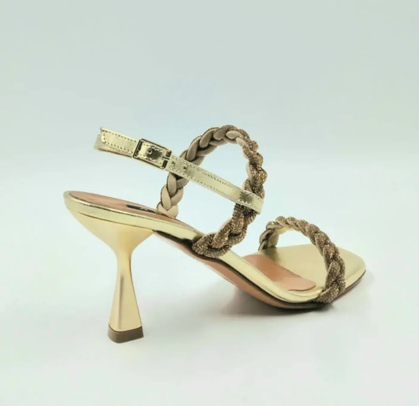 Sandali in pelle con trecce applicazione strass. Rivestito in pelle. Cinturino regolabile con fibbia. Fondo cuoio. Tacco 7cm