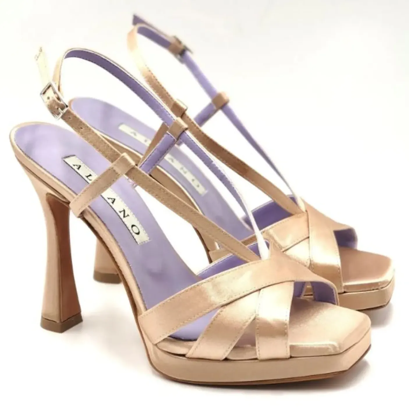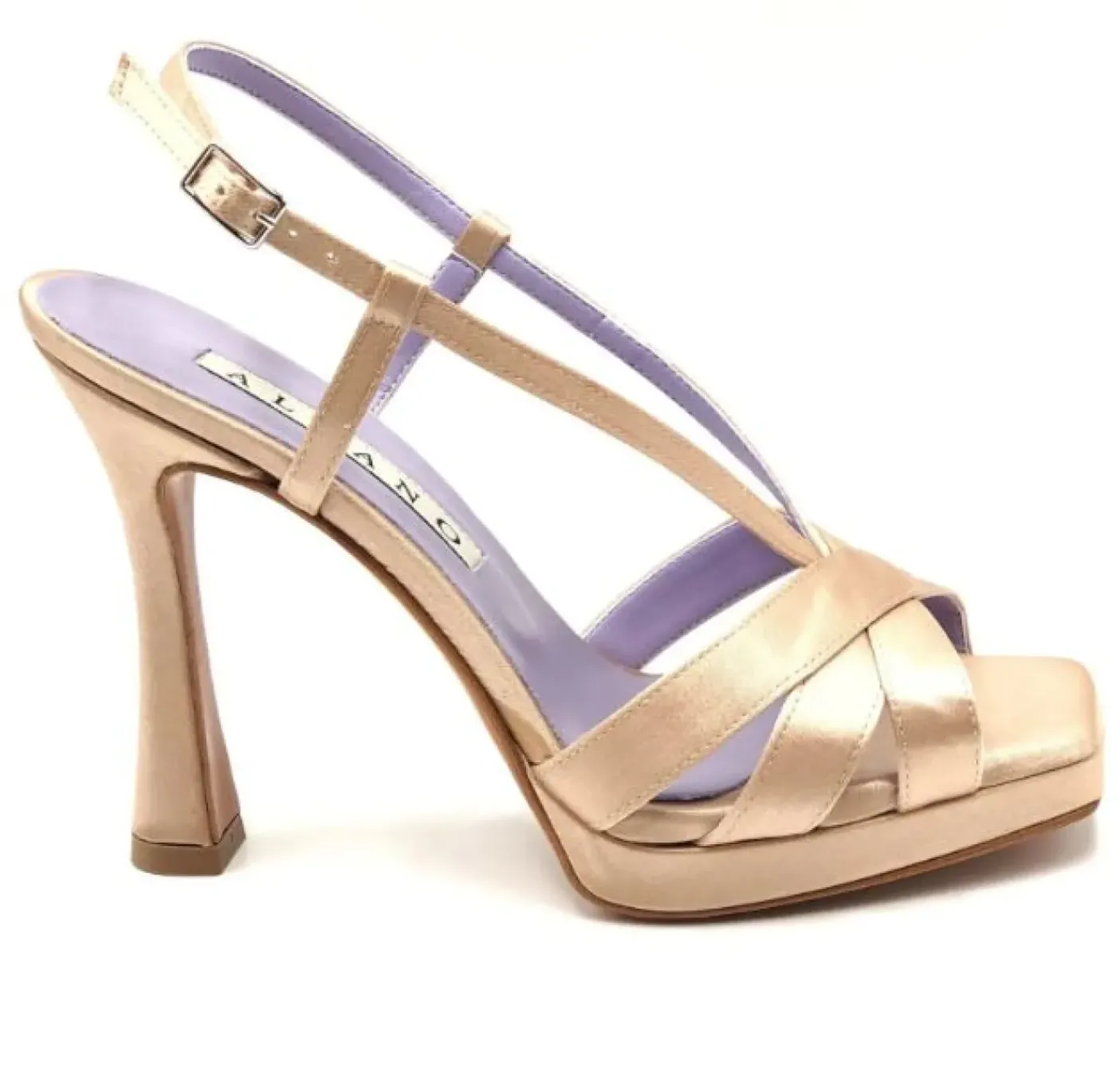 Sandalo in raso con strisce incrociate. Rivestito internamente in pelle. Soletta in pelle. Chiusura al lato regolabile. Tacco 11cm plateau 1cm.