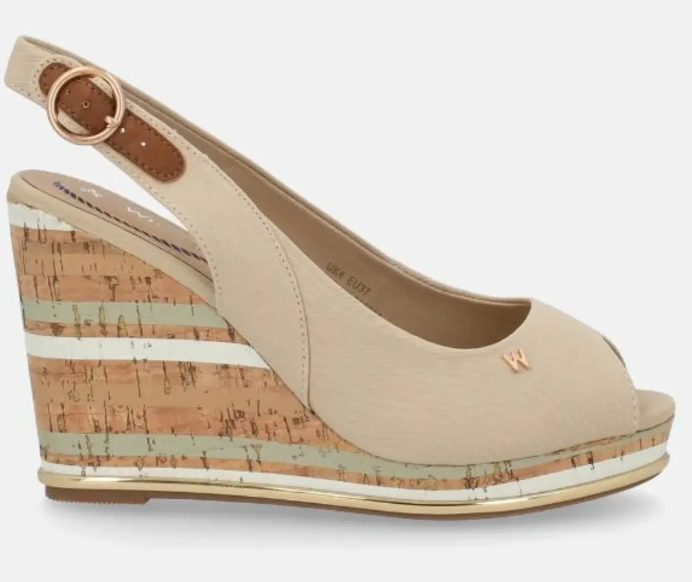 Sandali in tessuto, chiusura laterale regolabile. Soletta ecopelle. Tacco zeppa 9,5cm fondo gomma.
