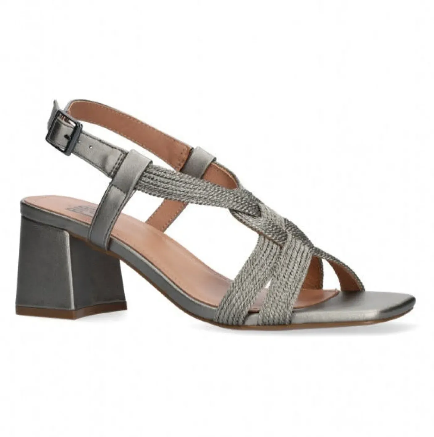 Sandali realizzati in tessuto similcorda ed ecopelle. Rivestito internamente in pelle. Chiusura con fibbia regolabile. Punta squadrata. Fondo in gomma. Tacco 6 cm