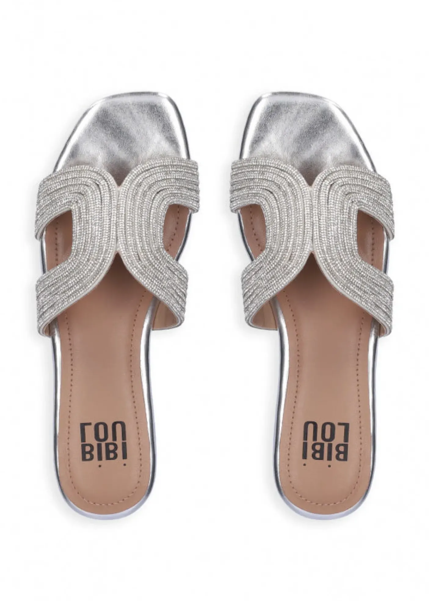 Sandali in materiale sintetico con micro strass. Rivestito internamente in pelle. Punta squadrata. Tacco piatto 1,5 cm