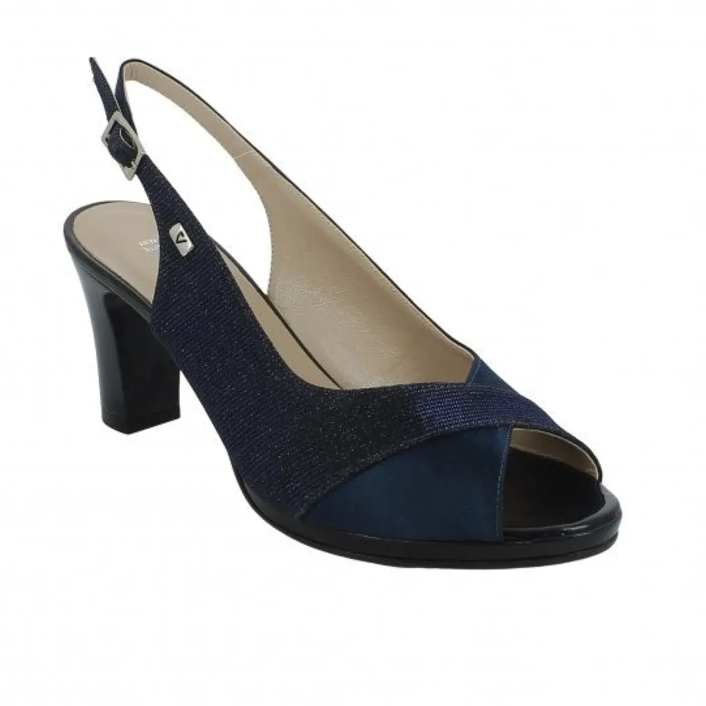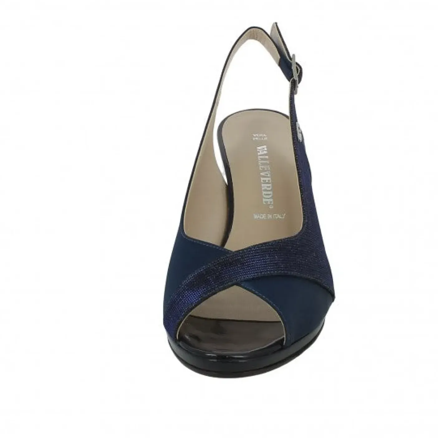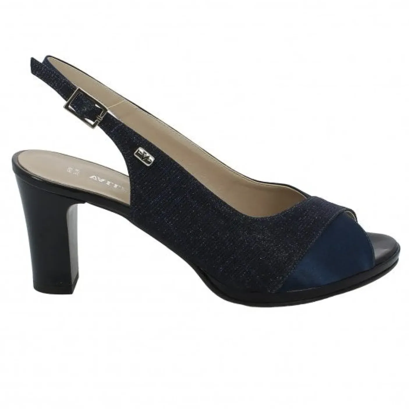 Sandali in tessuto brillantinato e tessuto blu. Rivestito internamente in pelle. Chiusura con fibbia regolabile. Sottopiede in vera pelle. Tacco 7cm
