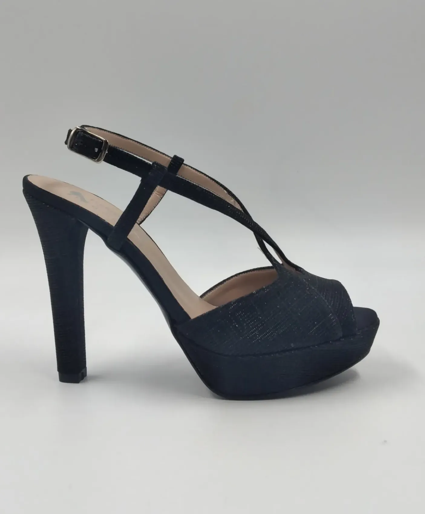 Sandali in tessuto laminato nero. Rivestita internamente in pelle. Chiusura regolabile alla caviglia. Tacco 12cm plateau 2cm