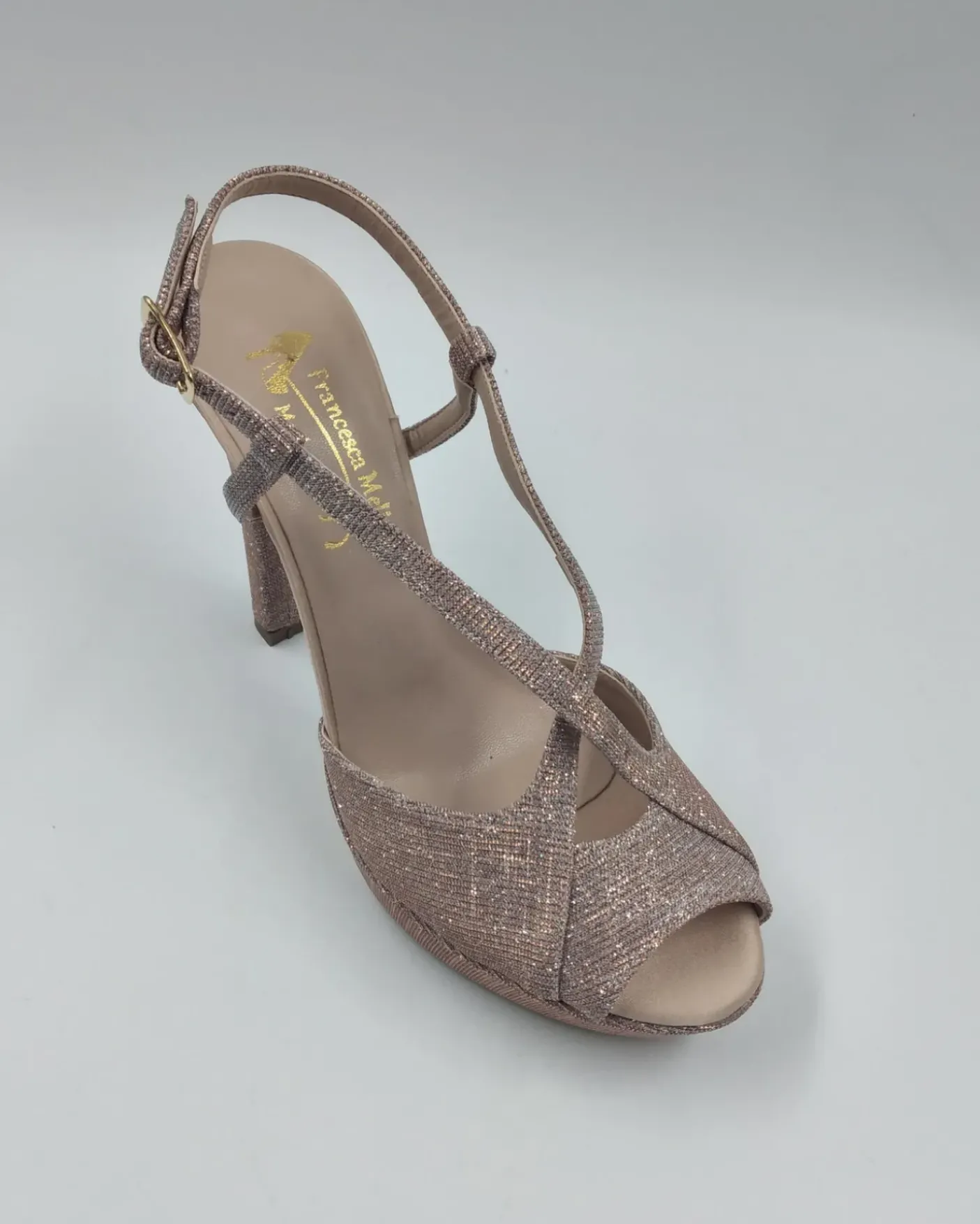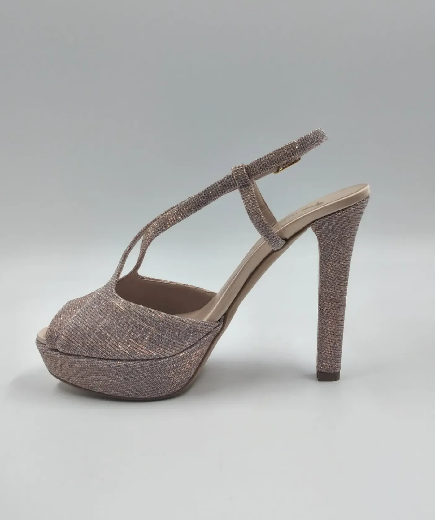 Sandali in tessuto laminato base rosa. Rivestita internamente in pelle. Chiusura regolabile alla caviglia. Tacco 12cm plateau 2cm