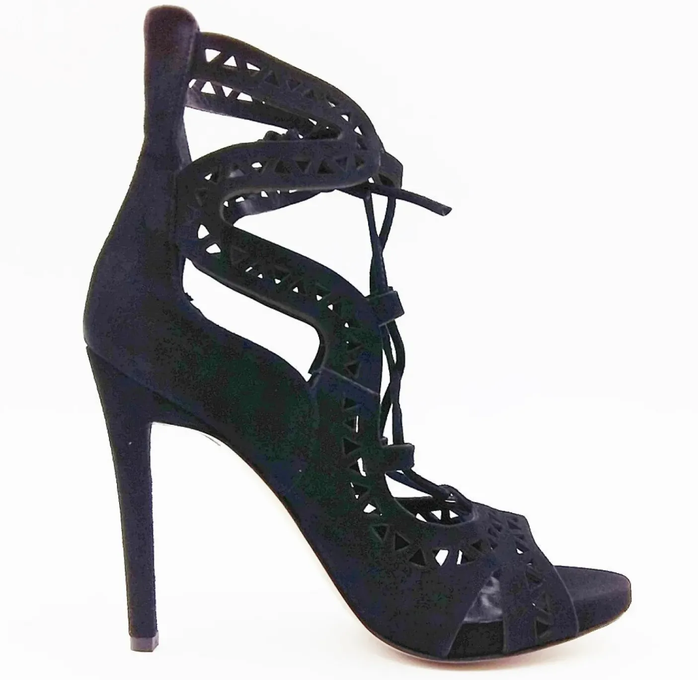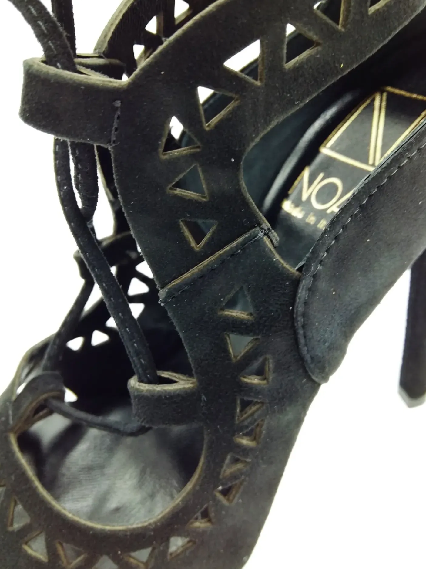 Sandali tronchetto in camoscio, rivestito internamente in pelle. Chiusura con lacci. Tacco rivestito in camoscio 12 cm. Suola in vero cuoio.