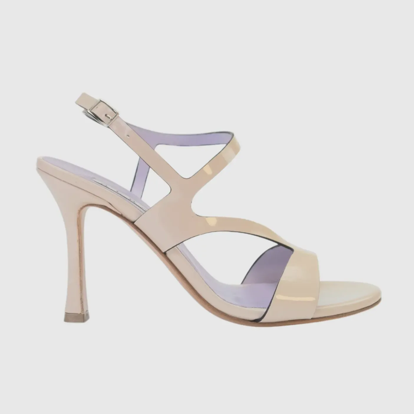 Sandali in vernice, rivestito internamente in pelle. Soletta in pelle. Chiusura regolabile. Fondo cuoio, tacco 8,5cm