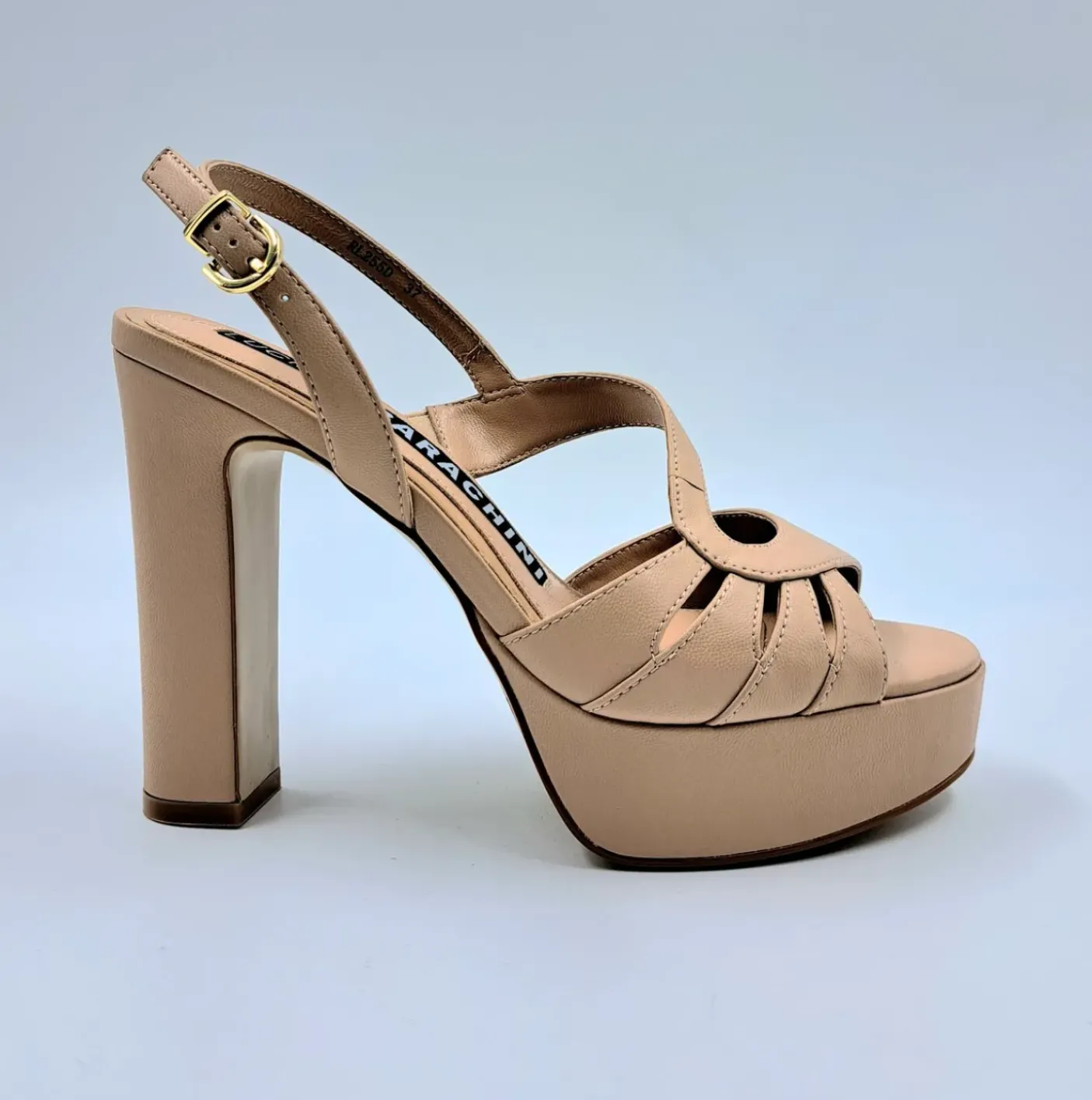 Sandali in vera pelle morbida con soletta in pelle. Chiusura alla caviglia regolabile. Tacco 12cm plateau 3cm.