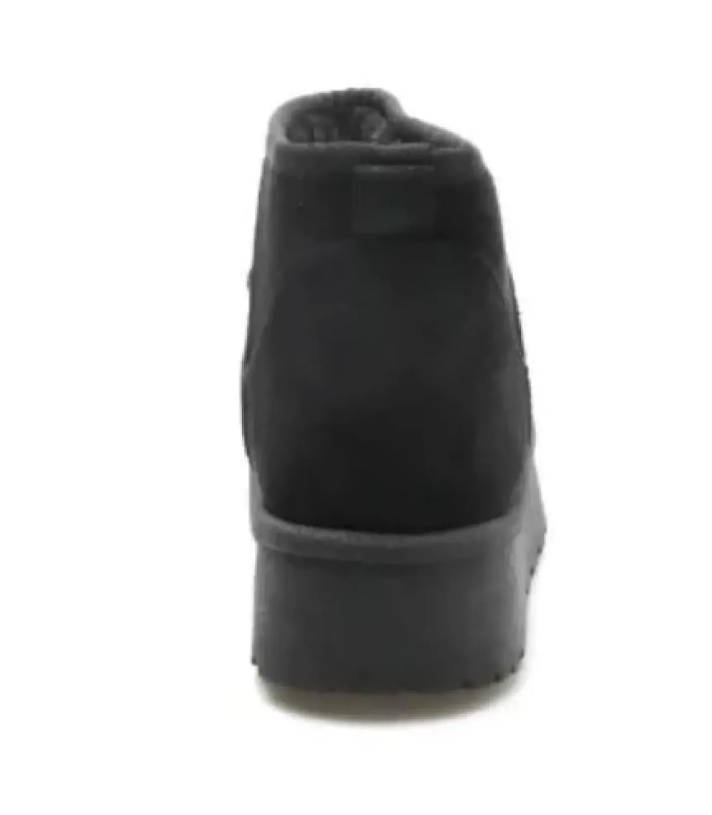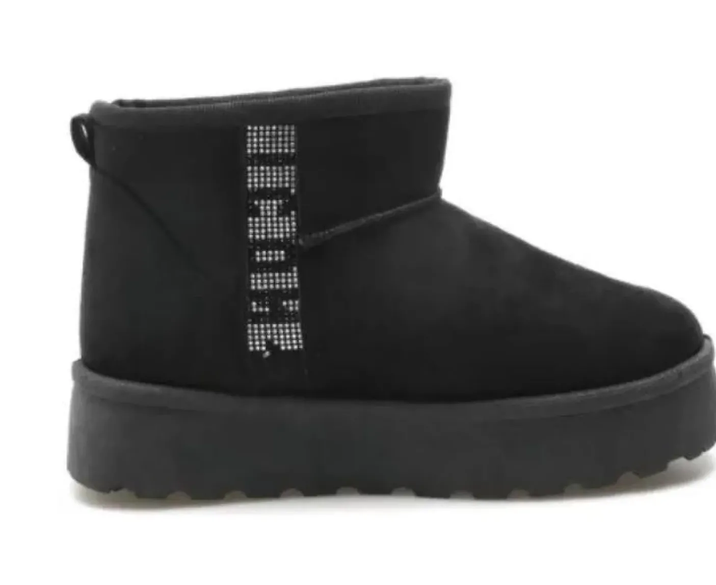 Scarponcino modello mammut in sintetico effetto camoscio imbottito, Soletta sintetica. Fondo gomma 4,5cm. Logo applicazione strass stricia sul fianco.
