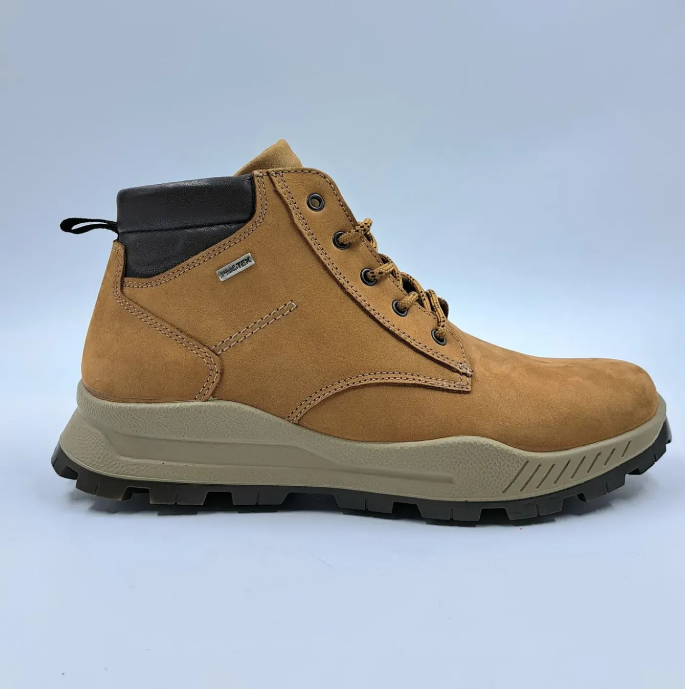 Scarponcini in vera pelle. Brevetto ImacTex idrorepellente= traspirante e resistente all’acqua, rivestito internamente in tessuto traspirante. Collarino imbottito, contrafforte di sostegno. Soletta in pelle imbottita. Fondo in gomma anti shock. Chiusura con lacci.